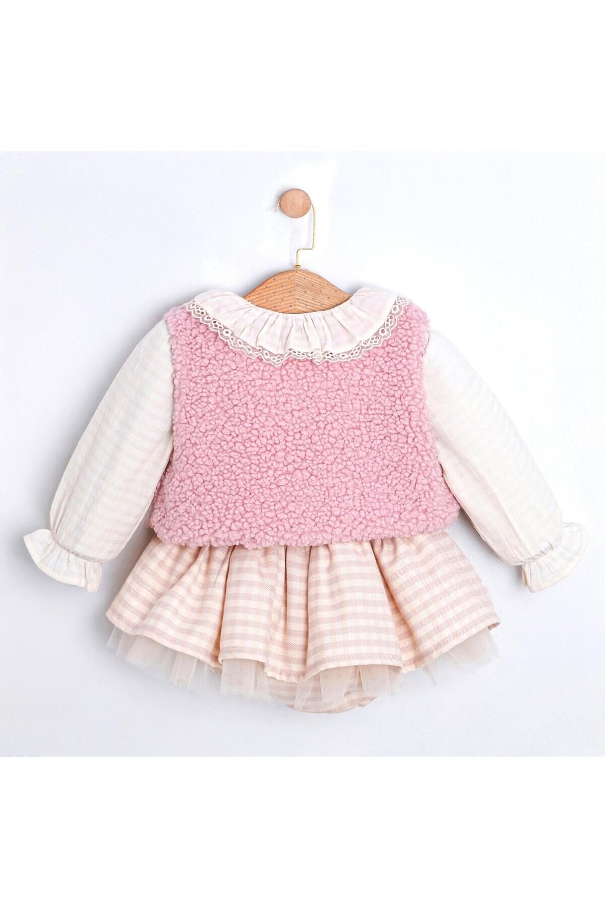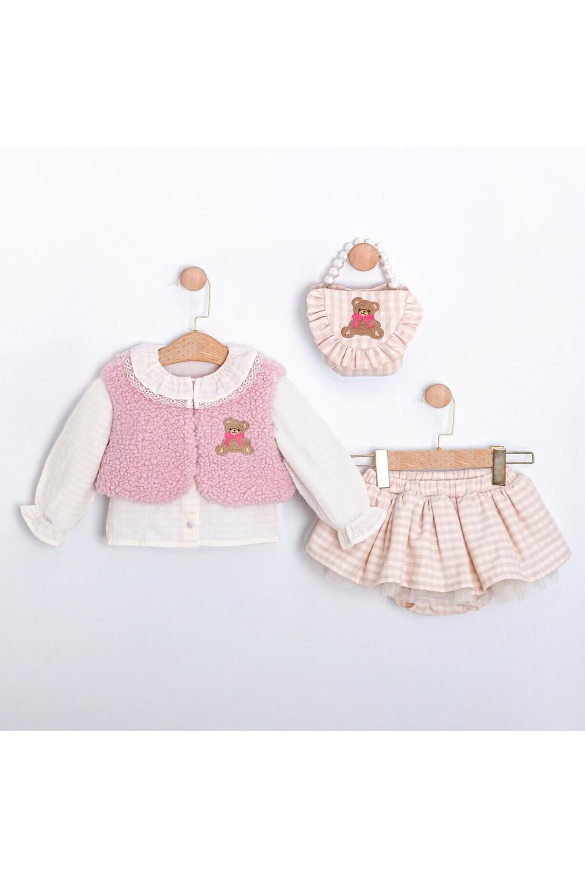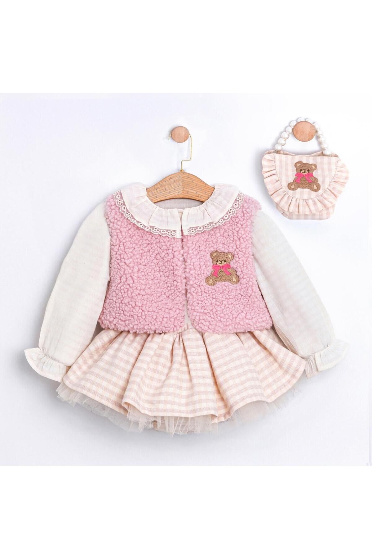Amaris Yelek Blüz ve Etekli Çanta Aksesuarlı Üçlü Kız Bebek Takım