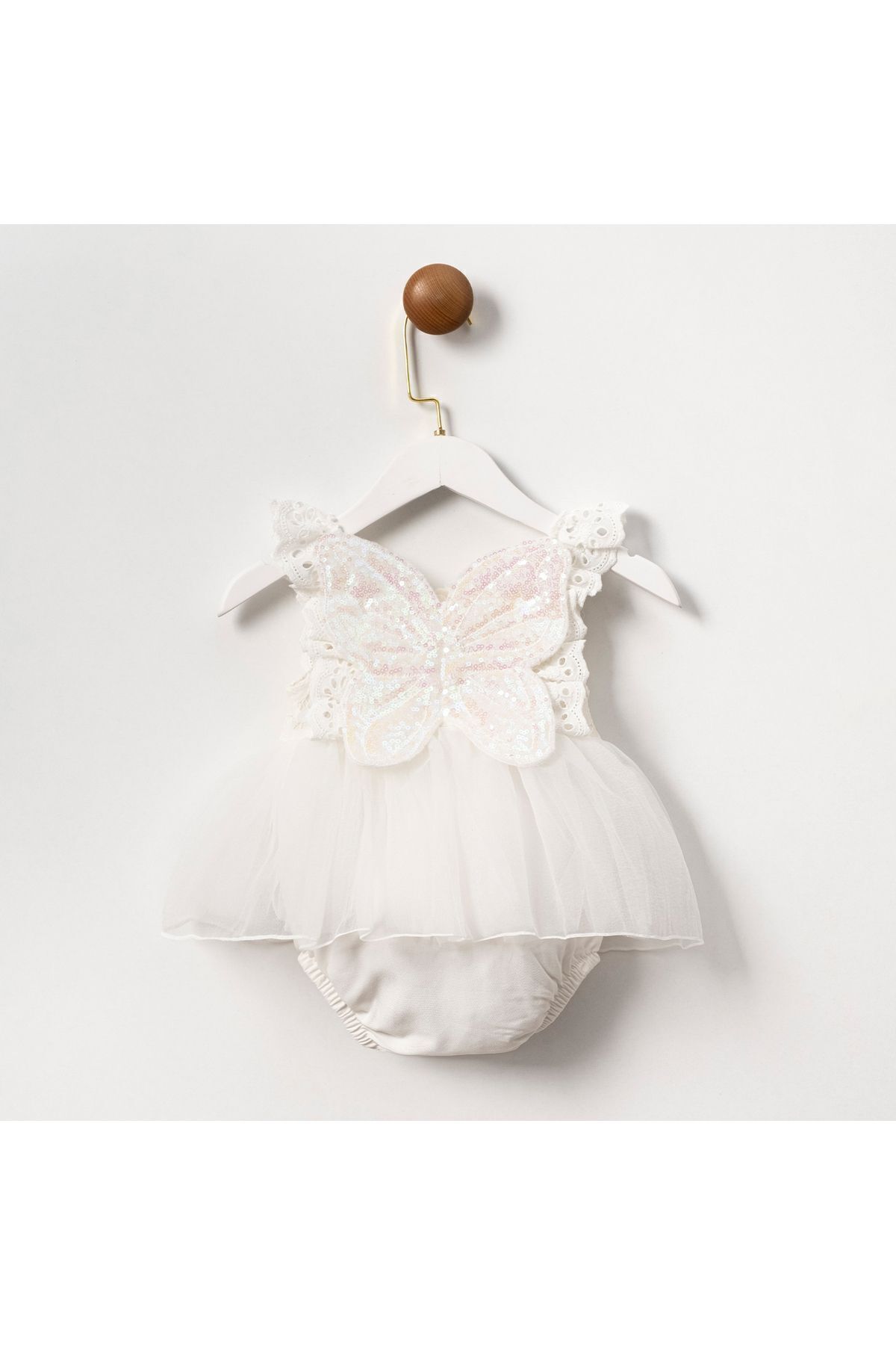 Bebeğinizin cildine nazik dokunuşuyla %100 pamuk materyalden üretilmiştir, hassas ciltler için idealdir; Standart boy kesimi ile bebeğinizin hareket özgürlüğünü kısıtlamaz ve rahat bir kullanım sunar; Dokuma kumaş tipi sayesinde dayanıklılık ve konforu bir arada yaşatır, uzun süreli kullanım için uygundur; Bebekler için özel olarak tasarlanmış kalıbı ile bebeğinizin vücuduna tam oturur ve şık bir görünüm sağlar; Angel pul kanat detayları ile sevimli ve eğlenceli bir stil sunar, bebeğinizin gardırobuna neşe katar;