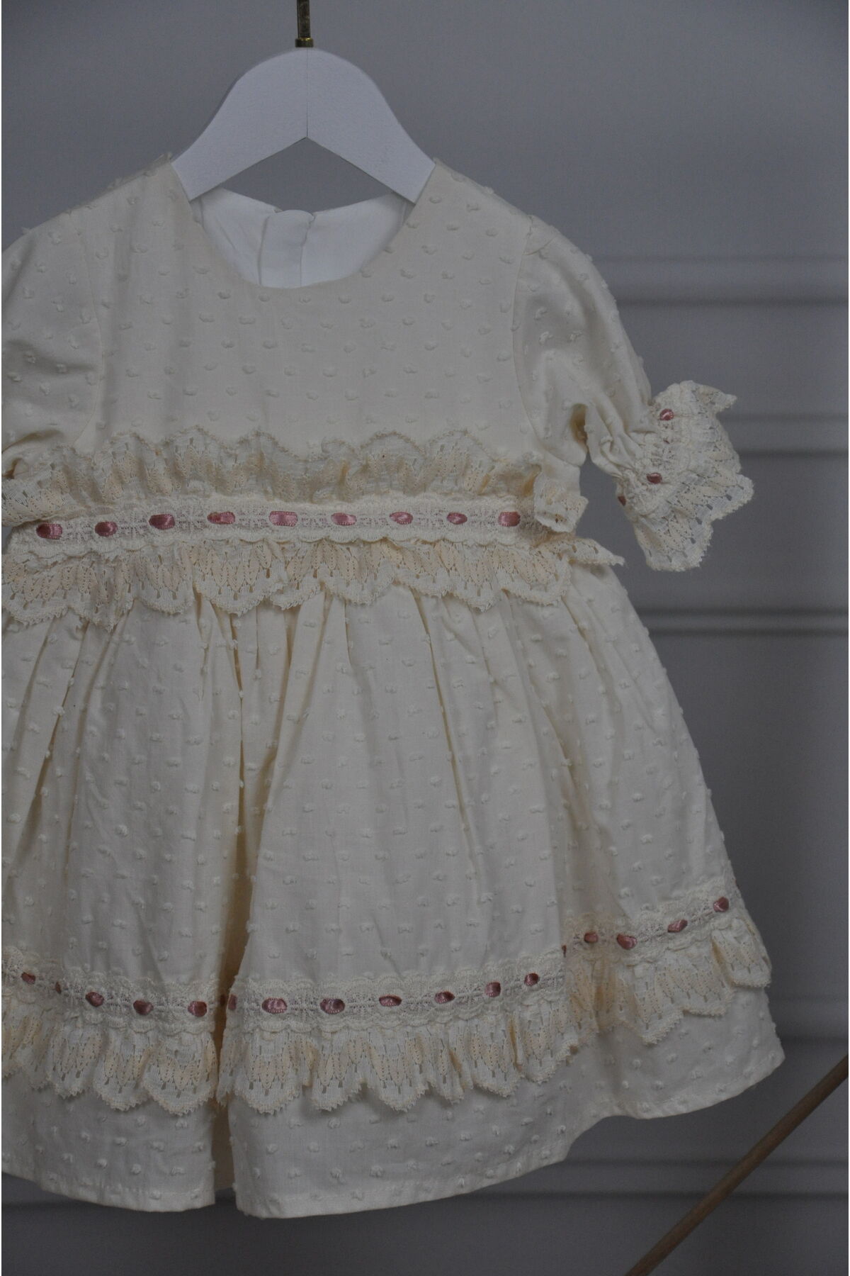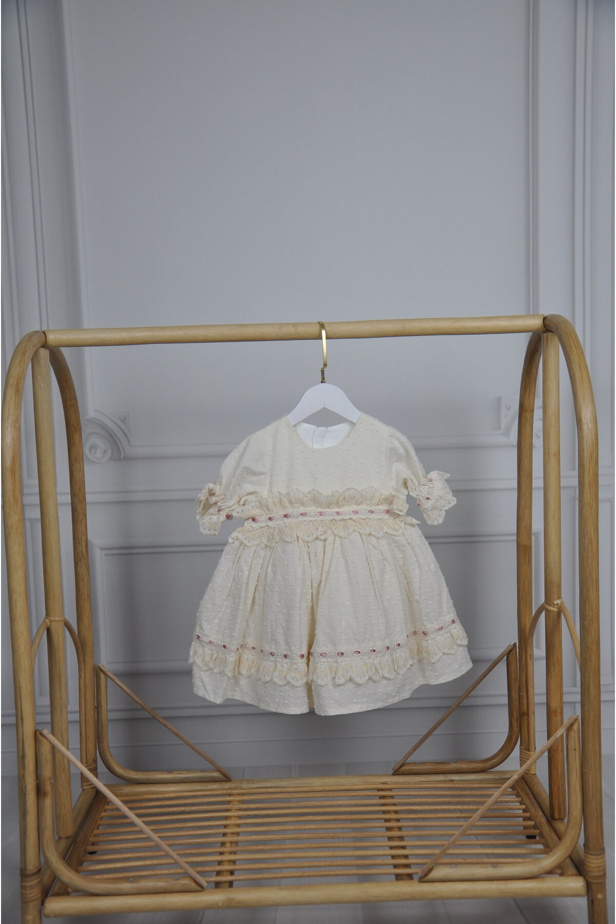 - Vintage tasarımıyla dikkat çeken bu kız çocuk elbisesi, şıklığı ve rahatlığı bir arada sunar.; - İç göstermeyen yapısı sayesinde çocuğunuzun konforunu ön planda tutar ve güvenle hareket etmesine olanak tanır.; - Fermuarlı kapama şekli ile kolay giydirme ve çıkarma imkanı sağlar; böylece ebeveynler için pratiklik kazandırır.; - İnce kalınlığıyla mevsim geçişlerinde ideal bir tercih olup, sıcak günlerde serinlik hissi verir.; - Astarlı olması sayesinde ekstra koruma sunarken, dokusuyla da zarif bir görünüm sağlar.; - Hassas yıkama talimatlarına uygun şekilde temizlenmesi, elbisenin uzun süre ilk günkü gibi kalmasına yardımcı olur.; - Tüm sezonlarda kullanılabilen çok yönlülüğüyle her ortamda şık duruşunu korur.; - Astarlı yapısı sayesinde içeriğinin gizlenmesini sağlayarak hijyenik bir kullanım sunar.; - Dokulu kumaşıyla göz alıcı detaylar barındırırken, kloş siluetiyle feminen bir hava katmaktadır.; - Bebek ve çocuklar için özel olarak tasarlanmış yaş grubuna uygun modellerle minik prenseslerinizi tamamlar.; - Regular kalıp seçeneğiyle vücuda tam oturan ancak sıkıştırmayan yapıya sahiptir; hareket özgürlüğünü kısıtlamaz.; - Dokuma kumaş tipi dayanıklılığı arttırarak ürünün formunu korumasına yardımcı olurken aynı zamanda yumuşak dokunuşuyla cildi tahriş etmez.; - Standart boy ölçüsüyle farklı bedenlere uyum sağlayacak şekilde dizayn edilmiştir; böylece her yaştaki kız çocuğu için idealdir.; - Menşe ülkesi Türkiye'de üretilmiş olup yerel malzemelerden elde edilen yüksek kaliteli malzemeler kullanılmıştır.; - %100 pamuk materyali sayesinde nefes alabilirlik özelliği taşır ve cilt dostudur; alerji riskini minimize eder.; - Gündüzden geceye her ortamda rahatlıkla tercih edebileceğiniz esnek kullanım imkanları sunar.; - Kısa balon kol tasarımı modern çizgilere sahipken bisiklet yakası minimalizmi ön plana çıkararak sofistike bir stil oluşturur.; Elbisenin boy ölçüsü 1-2 yaş 43 cm.; 2-3 yaş 48 cm
