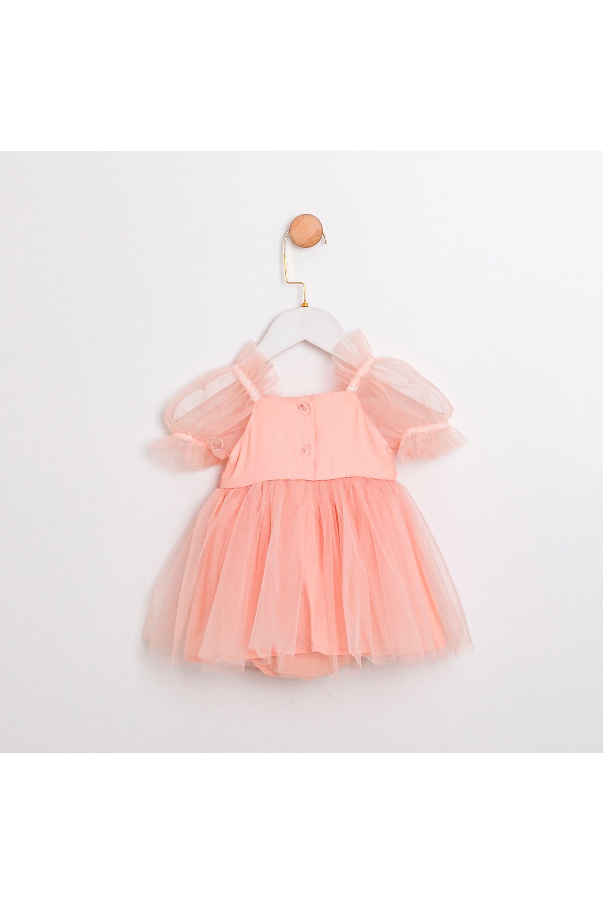 - %100 pamuk iç astarı ile bebeğinizin cildine nazik dokunuşlar sunar.; - Makinede hassas yıkama özelliği sayesinde kolayca temizlenebilir ve uzun süreli kullanım imkanı sağlar.; - Yarım pat düğme kapama şekli, pratik giyip çıkarmayı mümkün kılar.; - Bebekler için ideal kalıp seçimiyle hareket özgürlüğü tanır.; - Türkiye menşeli yapısıyla yerel üretim standartlarına uygunluk gösterir.; - Standart boy ölçüsüyle her bebek için uygunluk sağlar.; - Kısa kollu tasarım yaz ayları için serinlik ve konfor sunarken, bisiklet yakası modern bir görünüm kazandırır.; - Parti koleksiyonuna ait düz deseniyle sade ama etkileyici bir stil oluşturur.; - Tül materyali hafifliği ve zarafetiyle dikkat çekerken, parti ortamları için idealdir.;