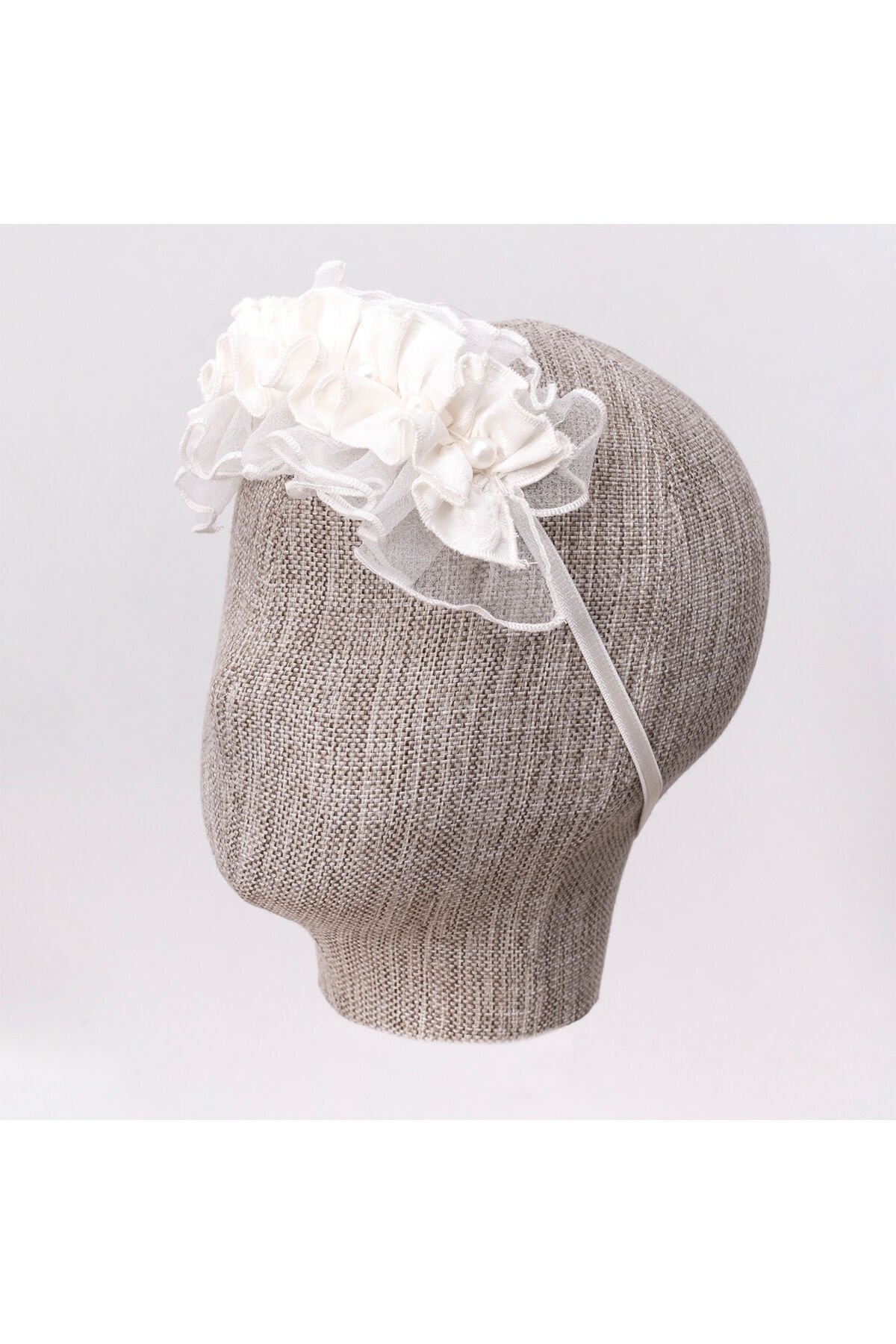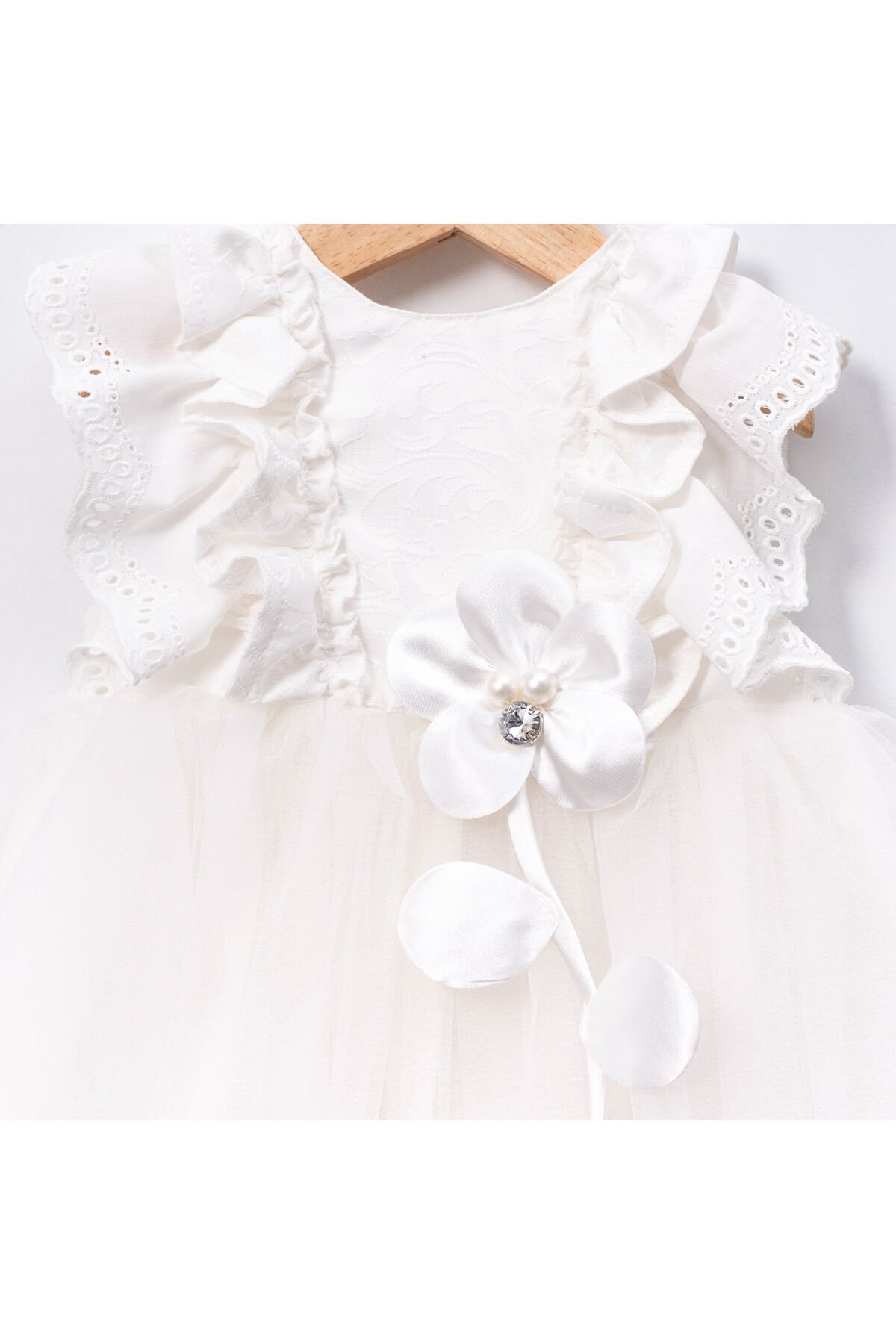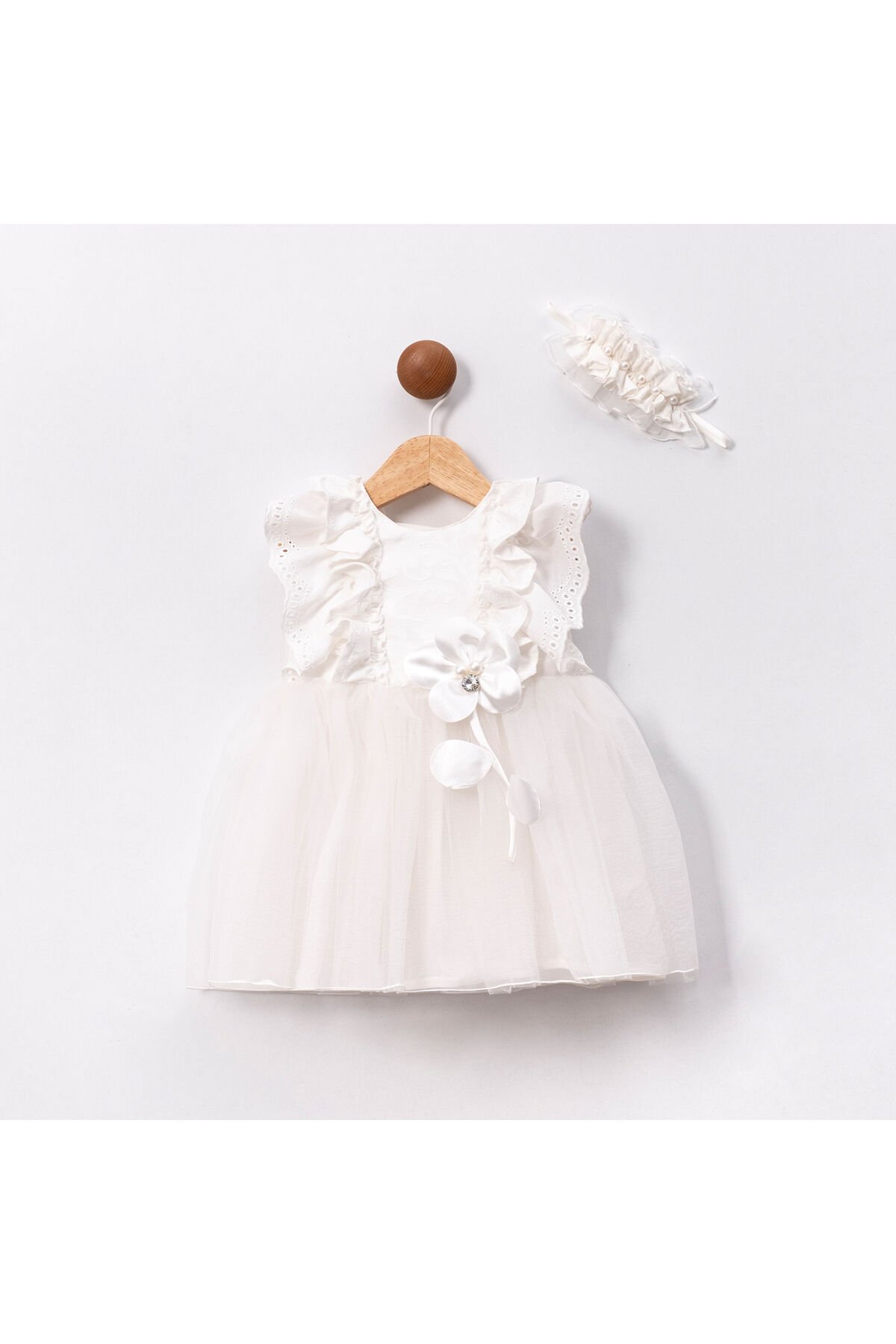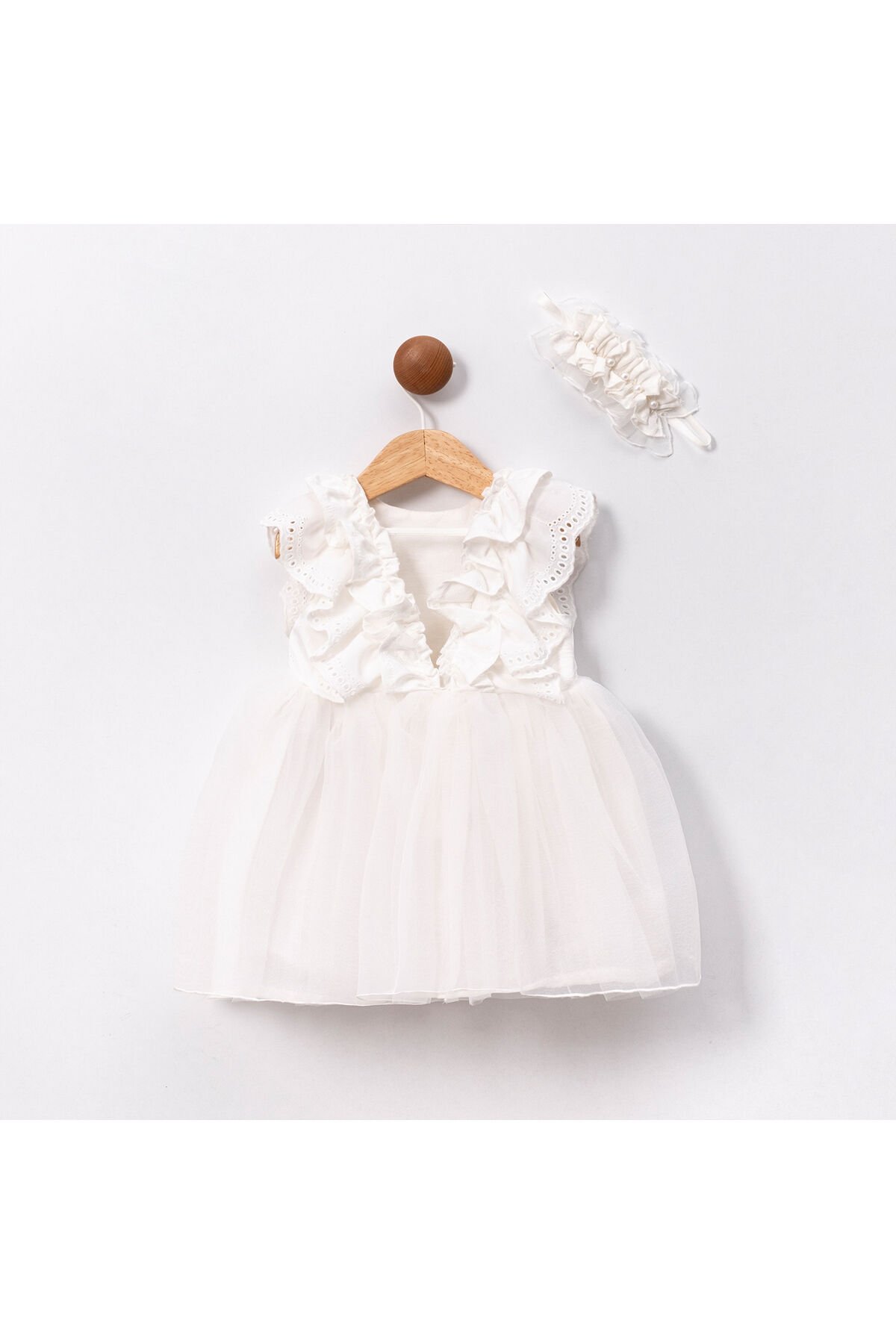 Beyaz Fistolu Fırfır Kollu ve Saç Aksesuarlı Kız Bebek Elbise