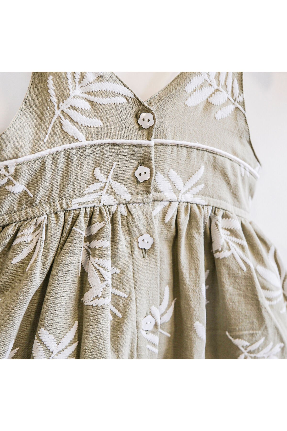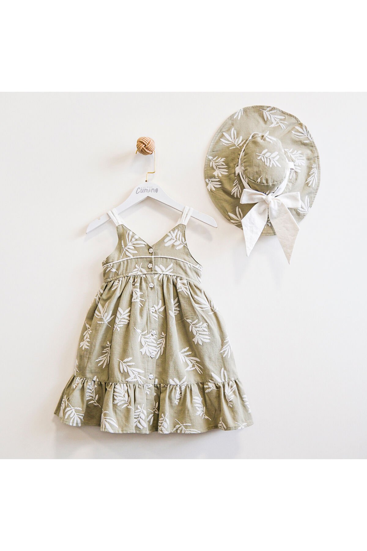 Organik pamuk materyali ile üretilmiş, çocukların cildine zarar vermeyen bir yapıya sahiptir.; - İki parçadan oluşan set; elbise ve şapka olmak üzere hem şıklığı hem de konforu bir arada sunar.; - Nakış işlemesiyle detaylandırılmış tasarımı, göz alıcı bir görünüm kazandırırken aynı zamanda dayanıklılığı arttırır.; - İnce yapısı sayesinde yaz ayları için idealdir ve hafifliğiyle çocuğunuzun rahat etmesini sağlar.; - Hassas yıkama talimatlarına uygun şekilde makinede yıkanabilir olması pratik kullanım imkanı tanır.; - Düğmeli kapama şekli kolay giyip çıkarmayı mümkün kılar ve küçük eller için bile uygundur.; - Dokuma kumaşı dayanıklılık ve uzun ömürlü kullanım vaat ederken, standart boy kesimi her bedene uyum sağlar.; - Çocuk modası koleksiyonuna özel olarak tasarlanmış bu parça, günlük kullanımda rahatlıkla tercih edilebilir.; - Askılı kol tipi ile serin tutma özelliği sunarken, soyut deseniyle modern ve trend bir görünüm kazandırır.;