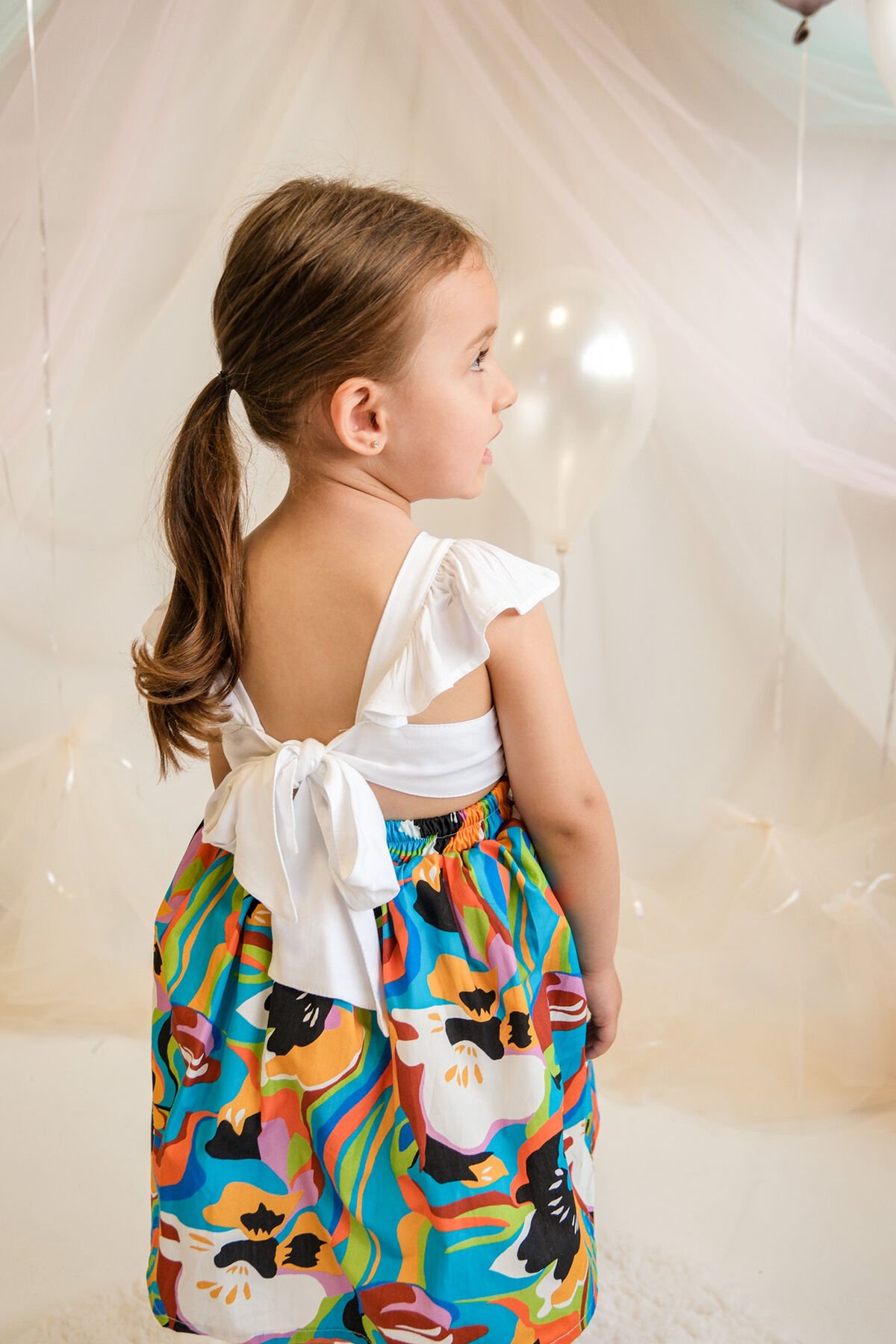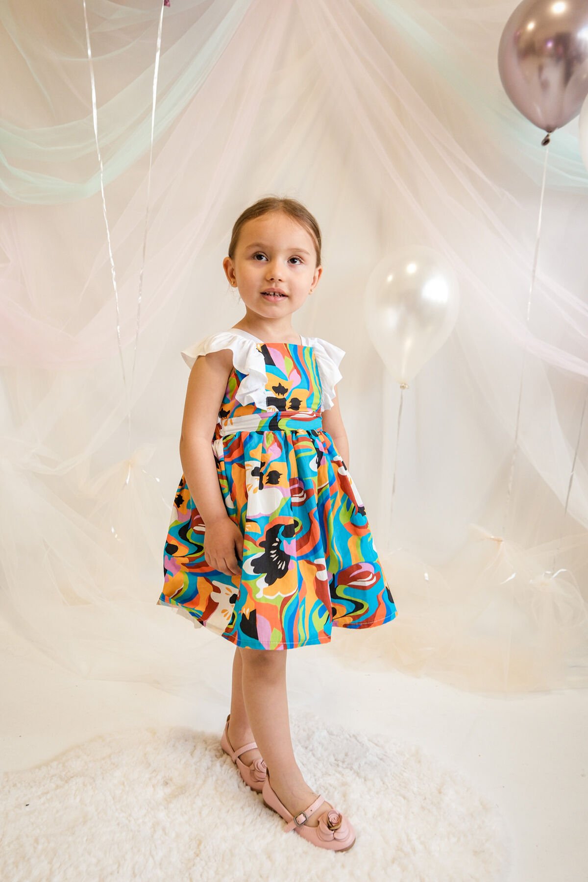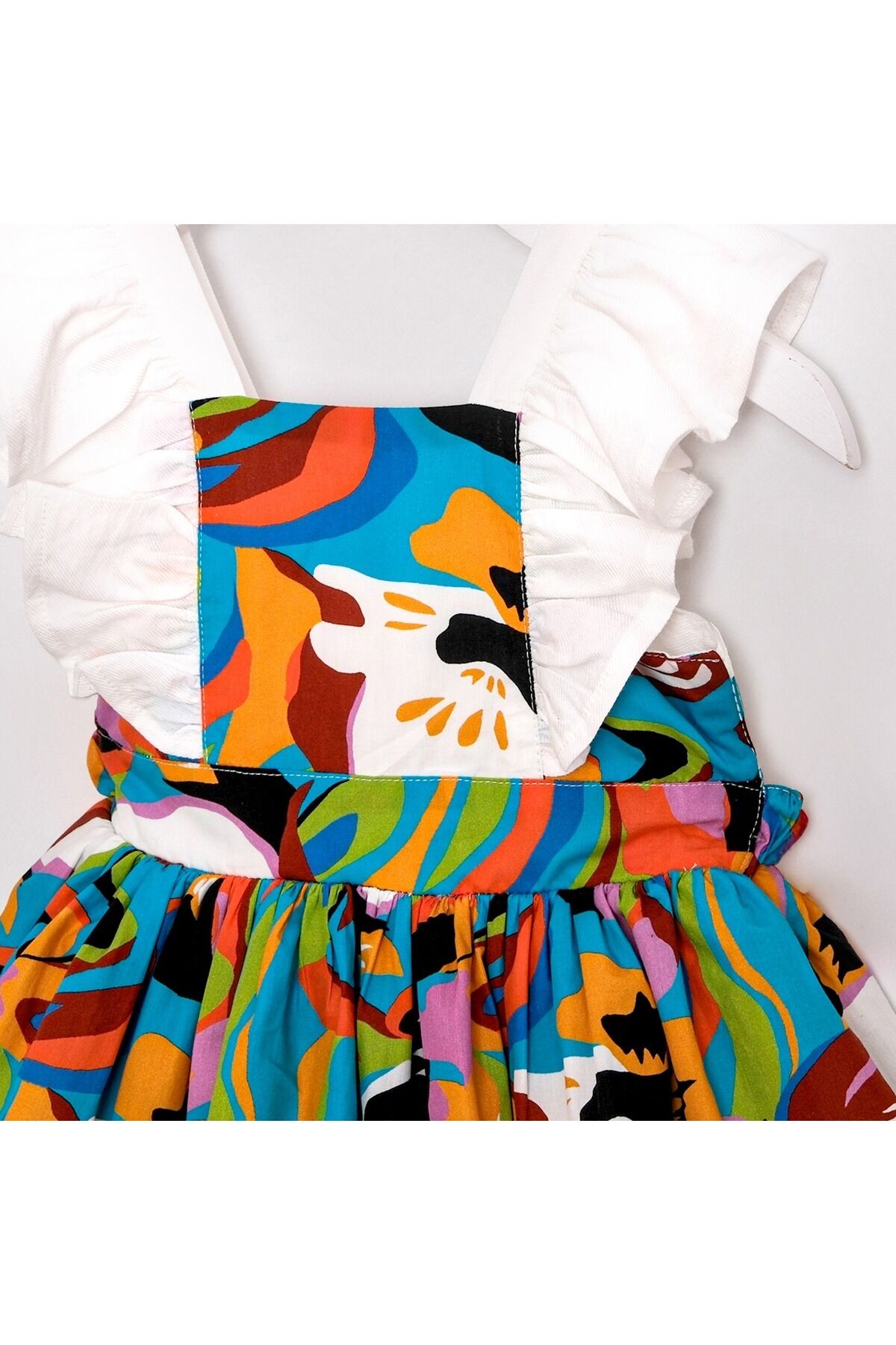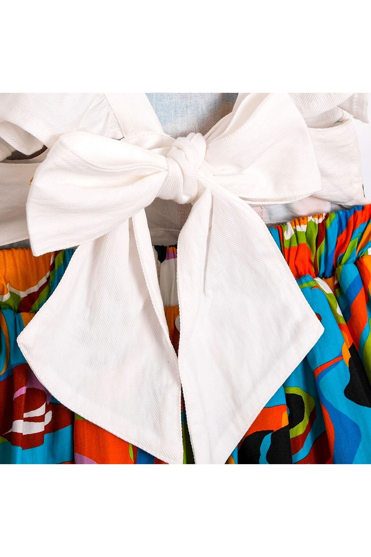 - Günlük kullanım için ideal, casual tarzıyla dikkat çeken bu elbise, yaz aylarının vazgeçilmezi olacak.; - Hassas yıkama talimatlarına uygun şekilde bakımı yapıldığında uzun süreli kullanım sunar.; - İç göstermeyen yapısıyla rahatlıkla tercih edilebilir; günlük aktivitelerde konfor sağlar.; - Astarlı olması sayesinde şık duruşunu korurken, kuşak detayı bel bölgesini vurgular.; - Fiyonklu tasarım detayları ile feminen bir dokunuş katarken, kemer olmadan da zarif bir siluet oluşturur.; - Jile kesimiyle hareket özgürlüğü sunarken, ince kumaşı hafifliğiyle gün boyu rahat etmenizi sağlar.; - Günlük ortamlarda rahatça giyebileceğiniz bu elbise, renkli deseniyle enerjinizi yansıtmanız için idealdir.; - Kare yaka tasarımı modern ve şık bir görünüm kazandırırken, kolsuz yapısı serin tutar.; - Dokuma kumaş tipi dayanıklılığı arttırarak sık kullanımlara karşı direnç gösterir.; - Çocuklar için uygun yaş grubuna hitap eden bu elbise, gençlerin tarzını yansıtır.; - Dokuma materyali sayesinde formunu koruyarak kaliteli bir kullanım sunar.; - Cepsiz oluşu pratiklik sağlarken, standart boyu her bedene uyumlu bir seçenektir.; - TR menşeli olması yerel kaynakların desteklenmesine katkıda bulunurken sürdürülebilirlik ilkesine bağlı kalır.; - Kloş kalıp ile feminen hatları ön plana çıkaran bu elbise, her vücut tipine uyum sağlayacak şekilde tasarlanmıştır.; - Standart paket içeriğiyle kolayca temin edilebilir; ekstra parçalara ihtiyaç duymadan kombininizi tamamlayabilirsiniz.