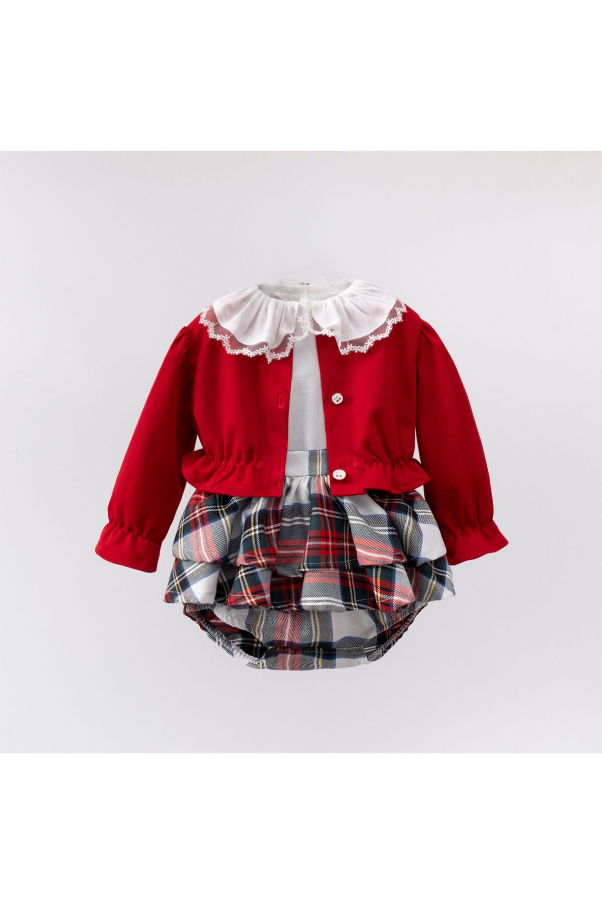 - Ekose ve kareli desenleriyle şık bir görünüm sunan 3'lü bebek takımı, miniklerin tarzını yansıtır.; - Kısa boy tasarımı ile rahat hareket etme özgürlüğü sağlar ve bebeğinizin konforunu ön planda tutar.; - Regular kalıp sayesinde bebeğinizin vücuduna tam oturur ve gün boyu rahat etmesini sağlar.; - Dokuma kumaş tipi, dayanıklılığı artırırken yumuşak dokusuyla bebeğinizin cildine nazikçe dokunur.; - Bebek & çocuk yaş grubuna uygun olarak tasarlanmıştır; hem şıklığı hem de rahatlığı bir arada sunar.; kız bebekler için özel olarak hazırlanmıştır.; - Canlı kırmızı rengi ile dikkat çeker ve enerjik kombinler oluşturmanıza olanak tanır.; - Kalın askılı tasarımı sayesinde uzun süreli giyimde bile konfor sağlar ve bebeğinizin omuzlarına ekstra destek verir.; - Dokuma materyali, ürünün formunu korumasına yardımcı olurken aynı zamanda nefes alabilir yapıda olmasıyla terlemeyi minimize eder.; - Bebe yaka kesimi ile zarif bir görünüm kazandırırken, aynı zamanda giydirme kolaylığı sağlar.; - 3'lü paket içeriği; hırkalı şortlu alt üst takım ile tam bir set halinde gelir, pratik kullanım sunar.; - Uzun kol boyu soğuk havalarda ekstra koruma sağlarken, orta kalınlıkta kumaşı mevsim geçişlerinde ideal konforu sunar.; - Astarsız yapısıyla bebeğinizin cildine nazikçe dokunur ve hassas ciltler için uygundur.; - Fırfırlı detayları ile sevimli ve eğlenceli bir stil oluştururken, hareket kabiliyetini kısıtlamaz.; - Hırkalı şortlu alt üst takım kombini ile hem şık hem de pratik bir giyim seçeneği sunar; farklı parçalarla kolayca kombinlenebilir.; - Trend ortamlarda dahi minik prensesleriniz için idealdir; stil sahibi anneler için de tercih sebebidir.; - Sürdürülebilirlik detayının bulunmamasına rağmen ürünün kalitesinden ödün verilmez; dayanıklılık ön planda tutulur.; - Beli lastikli tasarımı sayesinde giydirme esnasında kolaylık sağlar ve bebeğinizin rahat etmesini garanti eder.; - Kemersiz yapısıyla ekstra aksesuar ihtiyacını ortadan kaldırarak sade ve şık bir görünüm sunar.; - Hassas yıkama talimatına uyulduğunda ürün uzun süre ilk günkü gibi kalır; bakımı kolaydır.