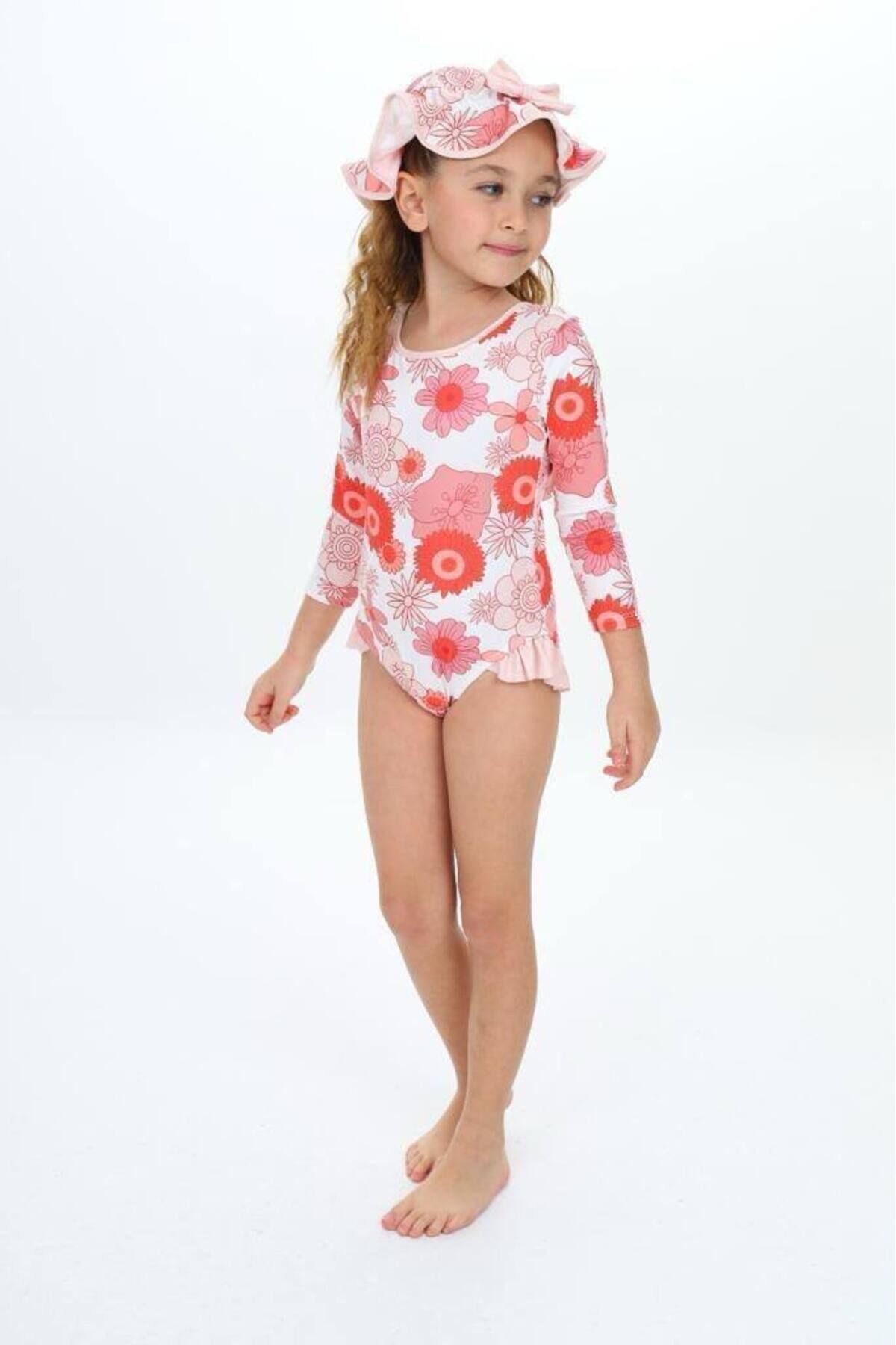 - Spor aktivitelerinizde rahatlıkla kullanabileceğiniz fırfırlı şapka aksesuarlı mayo, yaz sezonunun vazgeçilmez parçasıdır.; - Kutusuz tasarımı ile pratik kullanım sunar ve kolayca taşınabilir; plajda veya havuz başında ihtiyacınız olan her şeyi yanınıza almanızı sağlar.; - Tek parça halinde gelen bu mayo, ekstra eşya taşıma derdini ortadan kaldırır ve zamandan tasarruf etmenize yardımcı olur.; - Yıkanabilir özelliği sayesinde temizliği kolaydır ve sık yıkamalara karşı dayanıklılık gösterir.; - Çocuklar için özel olarak tasarlanmış olup, gençlerin enerjisine uygun renk ve desen seçenekleriyle dikkat çeker.; - Üretim yeri Türkiye'de gerçekleştirilmiş olup yerel malzemelerle üretilmiştir; kalite standartlarına uygunluğu garanti eder.; - Hem kadın hem de kız çocukları düşünülerek tasarlanmıştır; herkes için uygun bir seçimdir.; - Belirtilmemiş kumaş tipi ile esneklik ve konforu bir arada sunarak hareket özgürlüğünüzü kısıtlamaz.; - Kapsız yapısıyla modern ve şık bir görünüm kazandırırken aynı zamanda rahatlık hissi verir.; - Plaj tekstil koleksiyonuna ait bu mayo, çiçek desenleriyle göz alıcı detaylara sahiptir; stilinizi yansıtırken doğal güzellikten ilham almanızı sağlar.; - Uzun kol boyu sayesinde güneşin zararlı etkilerinden korunurken suyun içinde de rahatça yüzebilirsiniz.