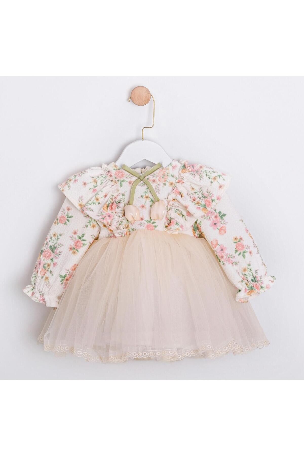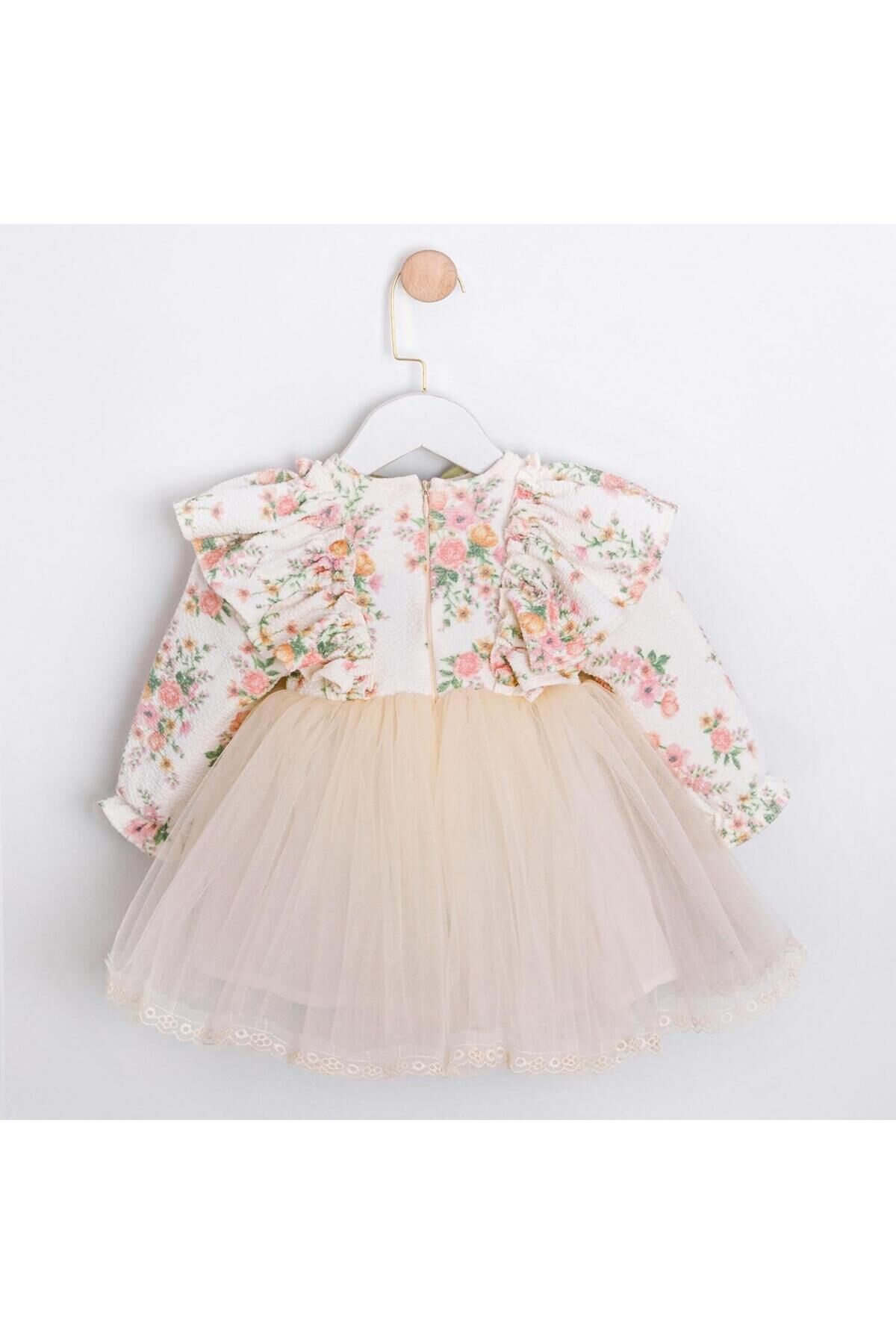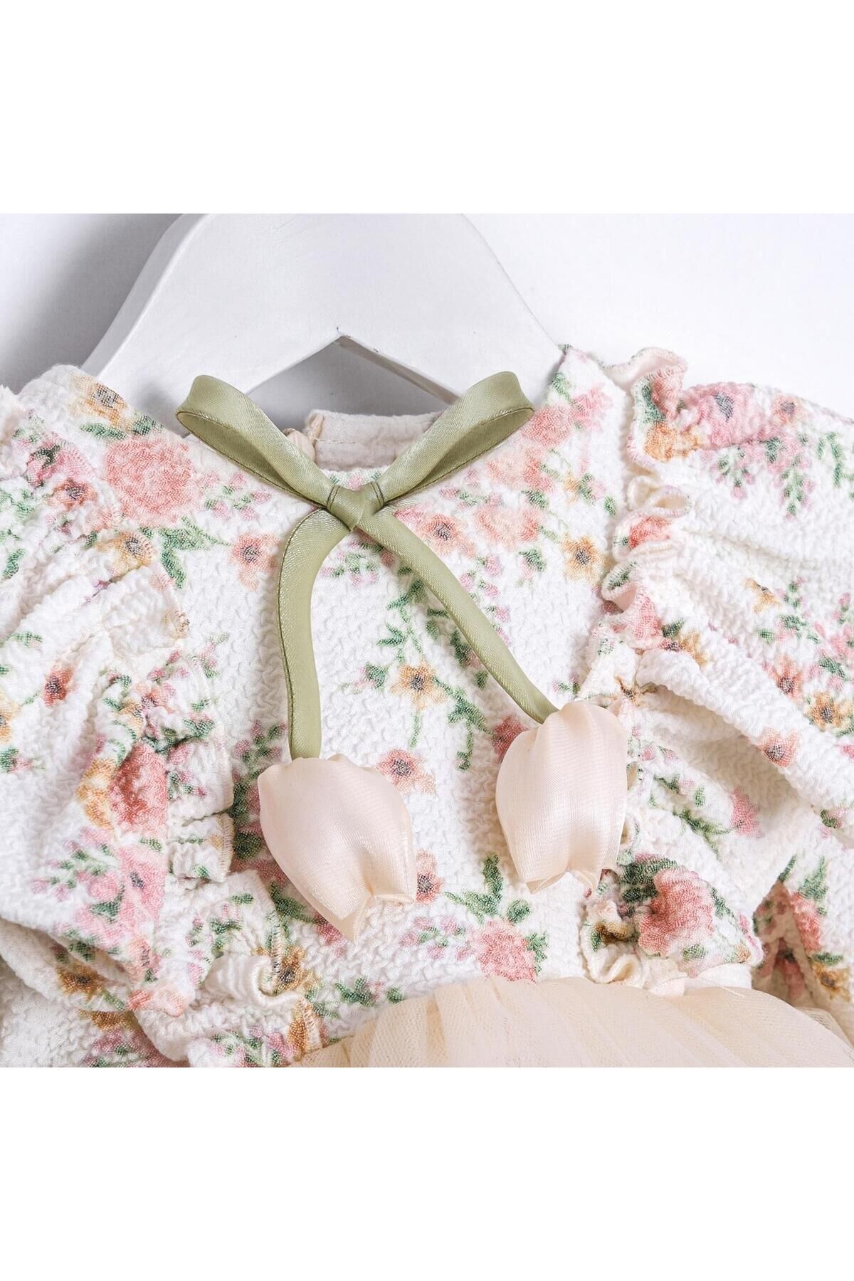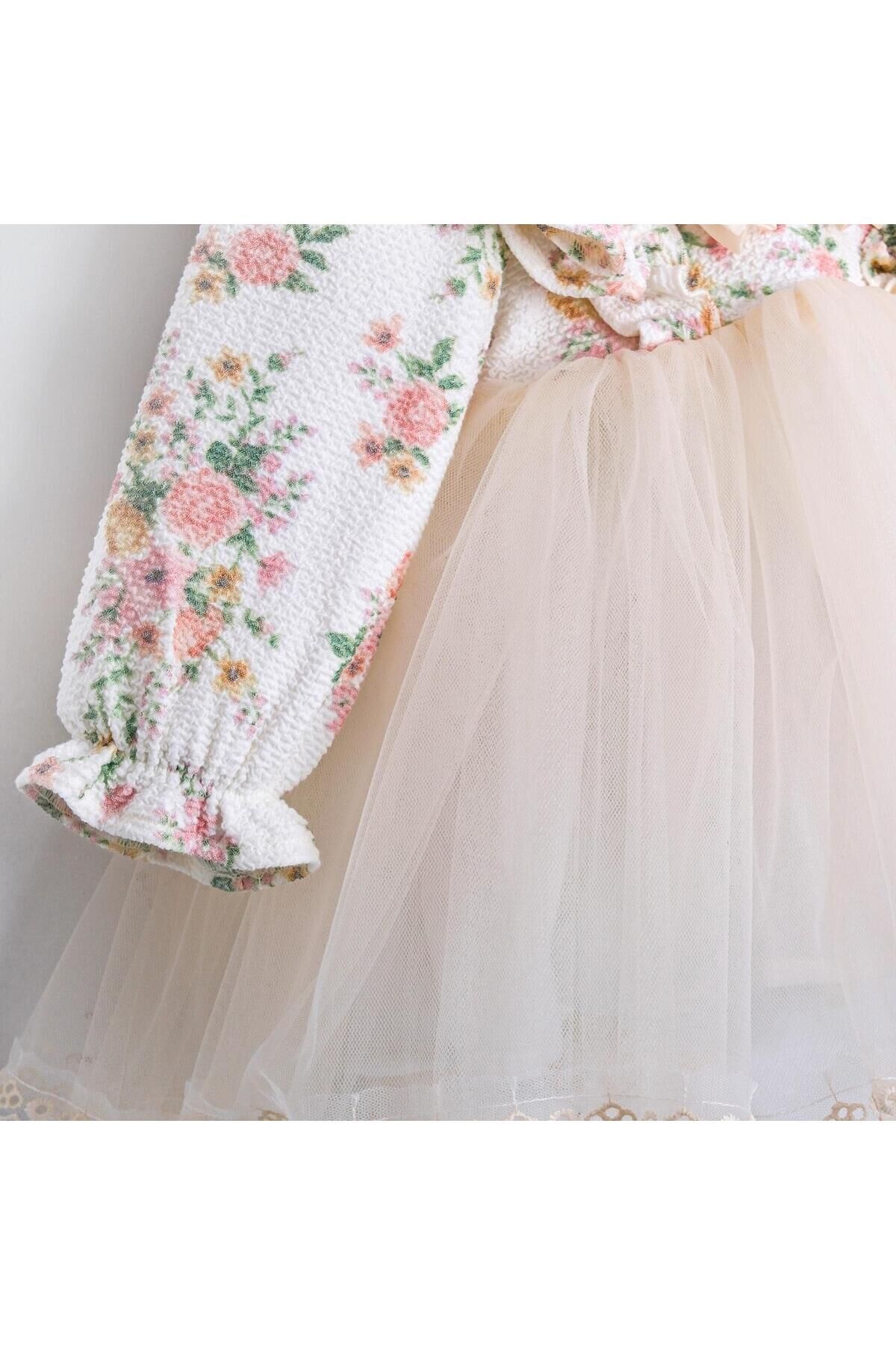 Flora Çiçek Desenli Tül Etekli Uzun Kollu Bebek Elbisesi