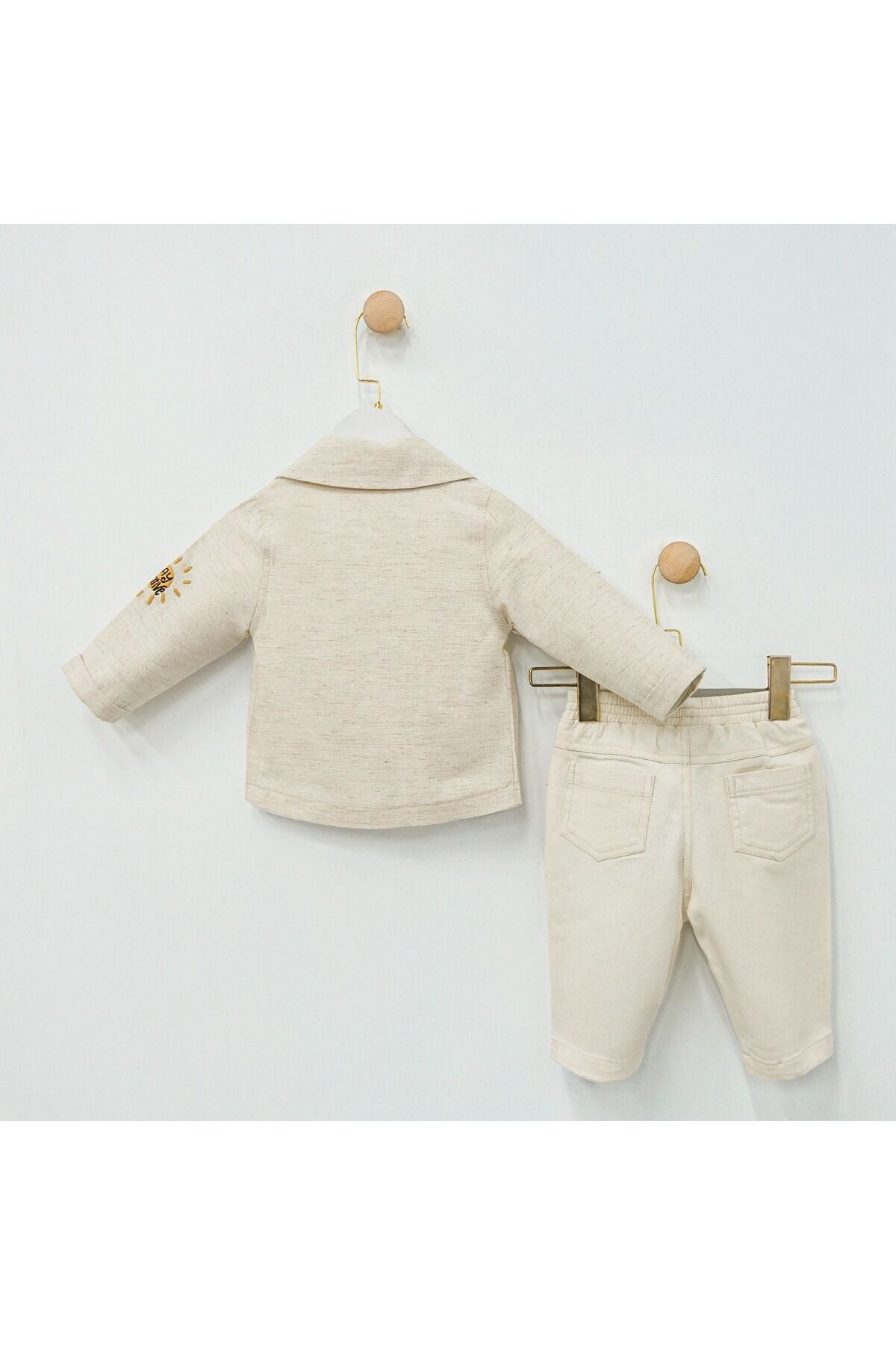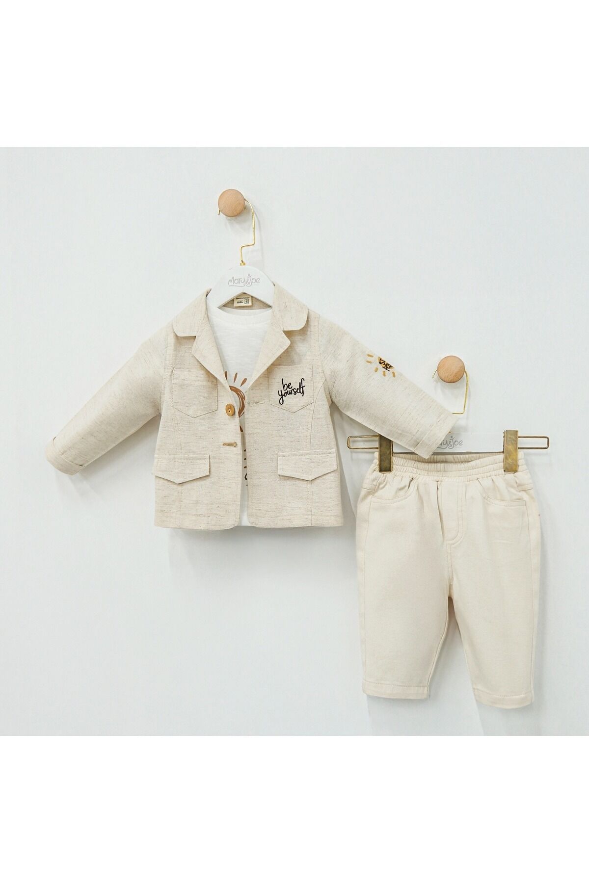 - Orta kalınlıkta kumaşı ile mevsim geçişlerinde ideal konfor sunar.; - Kemer veya kuşak gerektirmeyen tasarımıyla pratik kullanım sağlar.; - Üç parçadan oluşan set, günlük giyimde şıklığı ve rahatlığı bir arada sunar.; - Hassas yıkama talimatlarına uygun şekilde kolayca temizlenebilir; böylece ürün ömrü uzar.; - Her sezon tercih edilebilen bu takım, zamansız bir stil oluşturmanızı sağlar.; - Lastikli bel yapısı sayesinde vücuda mükemmel uyum sağlar ve hareket özgürlüğü tanır.; - Çift cepli tasarım, küçük eşyalarınız için ekstra saklama alanı sunarken fonksiyonellik kazandırır.; - Sıfır yakası ile modern ve minimalist bir görünüm elde edilirken, aynı zamanda sıcak tutma özelliği de bulunur.; - Boru paça kesimiyle hem spor hem de resmi ortamlarda rahatlıkla tercih edilebilir.; - Dokuma kumaş tipi dayanıklılığı arttırarak uzun süreli kullanım imkanı sunar.; - Bebekler için özel olarak tasarlanmış olup, miniklerin konforunu ön planda tutar.; - Erkek cinsiyetine hitap eden bu takım, her yaş grubundaki erkek çocuklar için uygundur.; - Regular boy kesimiyle farklı vücut tiplerine uyum sağlayacak şekilde dizayn edilmiştir.; - Kırçıllı deseniyle göz alıcı detaylara sahip olan bu takım, dikkat çekici bir tarz yaratmanızda yardımcı olur.; - Türkiye'de üretilmiş olmasının getirdiği avantajla yerel malzemelerle kalite standartlarını korurken ekonomik avantaj da sunar.