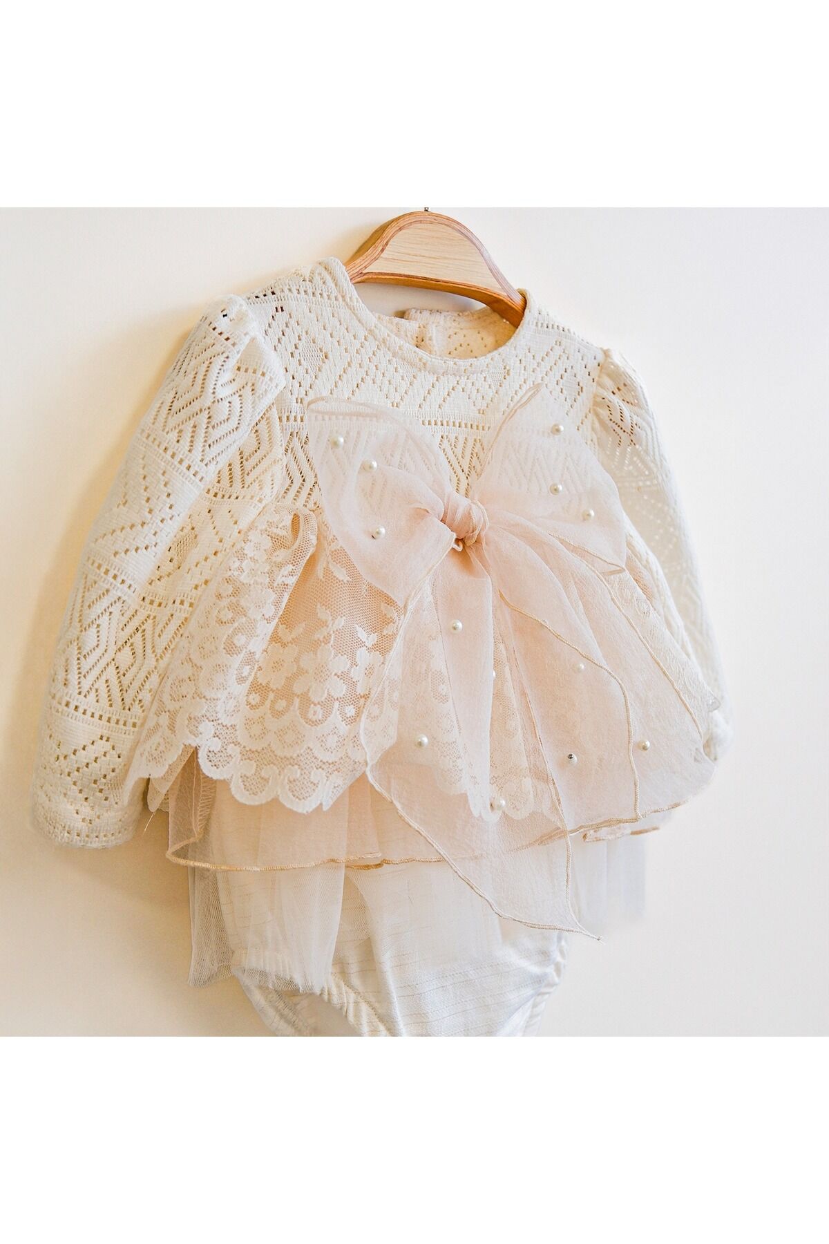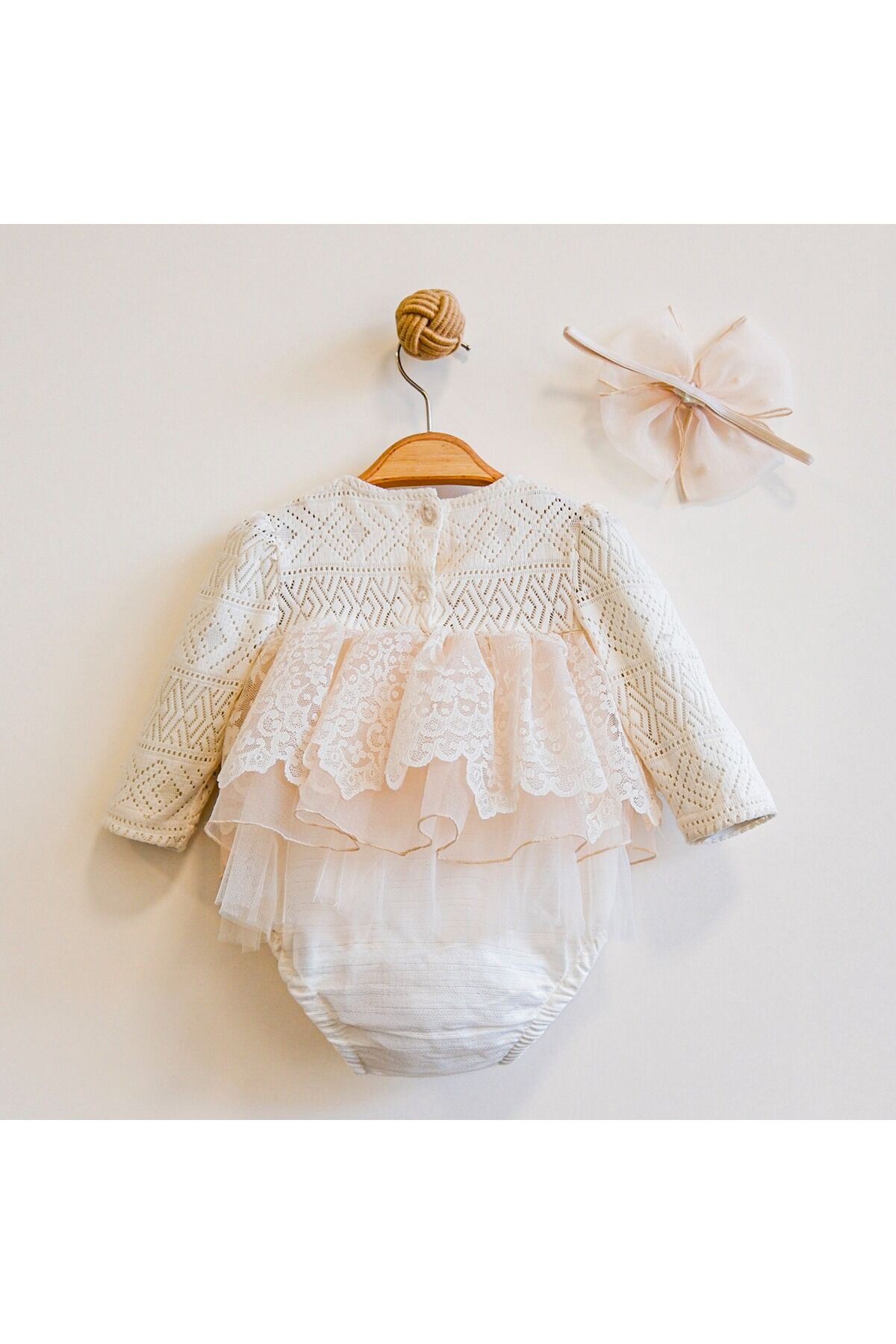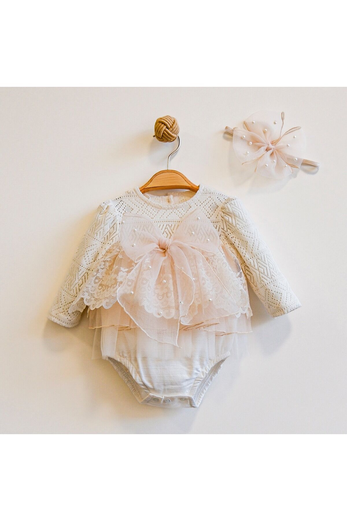 Zarif inci detayları ve dantel işlemeleriyle süslenmiş, kız bebeklerinize özel tasarlanmış bir romper.; - Bebeğinizin cildine nazik dokunuşlar sunan pamuklu kumaştan üretilmiştir.; - Bej rengi ile her türlü aksesuarla kolayca kombinlenebilir ve şıklığı tamamlar.; - Günlük kullanım için ideal olan bu romper, bebeğinizin rahat hareket etmesini sağlayacak şekilde tasarlanmıştır.; - Uzun kollu yapısıyla mevsim geçişlerinde de konforlu bir seçenek sunar.; - Fiyonk dantel detaylı tokası sayesinde pratik kullanım imkanı tanır; böylece bebeğinizin saçlarını sabit tutmak daha kolay olur.; bebekler için uygun beden seçeneğiyle minik prenseslerinizi düşünerek tasarlandı.; - Makinede hassas yıkama talimatına uyarak uzun süreli kullanım için idealdir.; - Paçasız kesimiyle modern ve zarif bir görünüm kazandırırken, alt kısmında bulunan düz kumaşı da ekstra konfor sağlar.