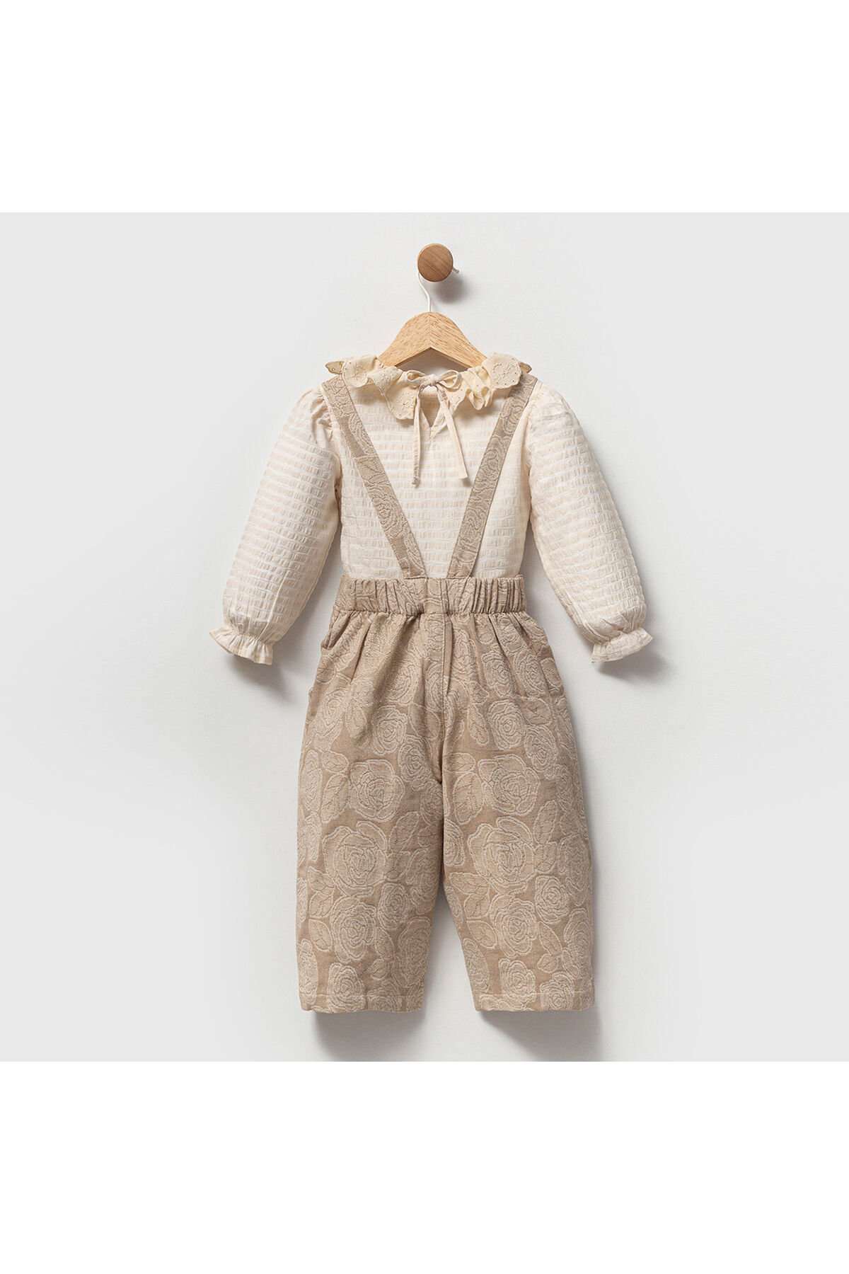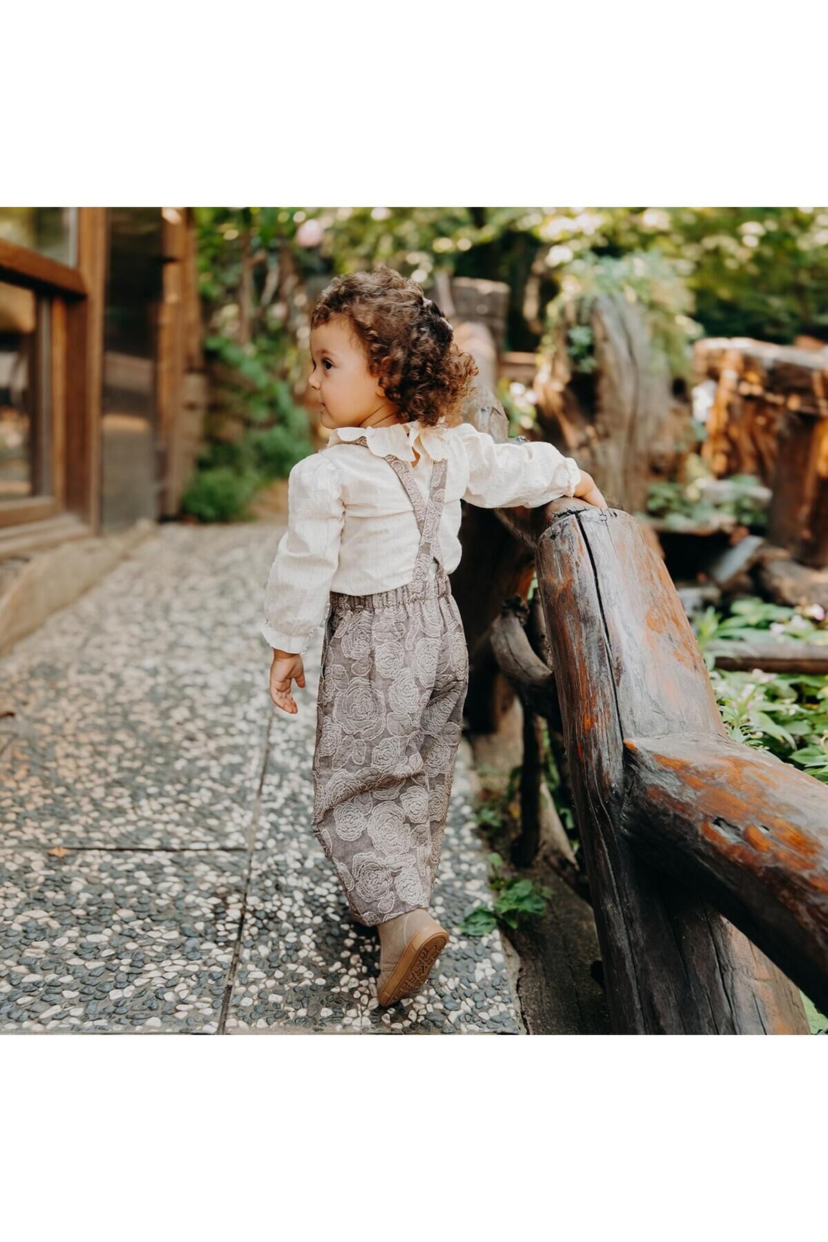 Jany Kız Çocuk Önü Kalpli Çiçek Desenli Uzun Paçalı Salopet Takım - Dantel Yakalı Bluzlu Şık Tulum