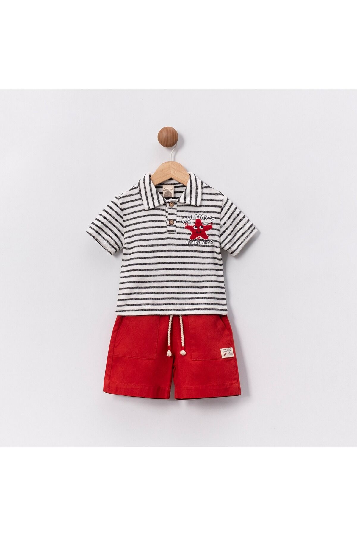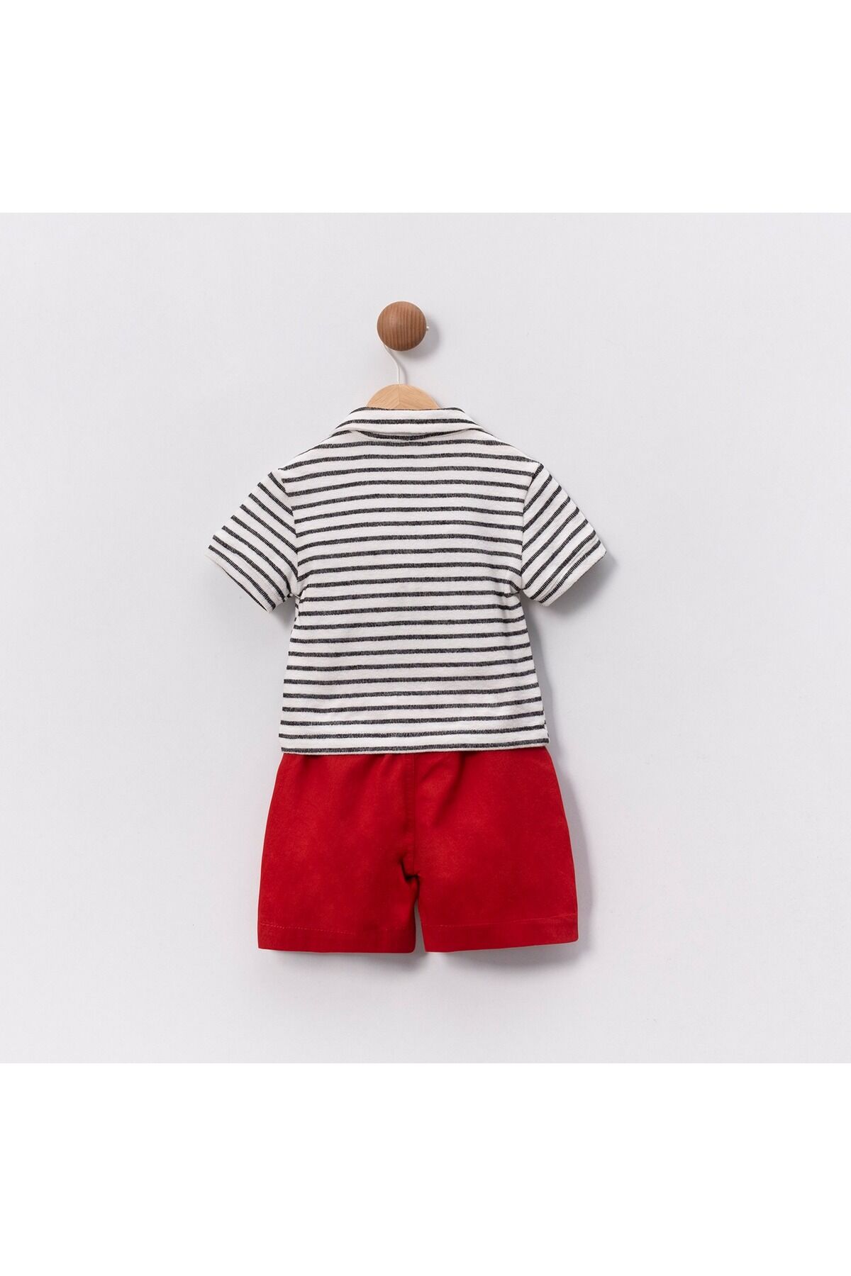 - İnce yapısıyla hafif ve rahat bir kullanım sunar.; - Tek pakette 2 parçadan oluşan set, pratik bir kombinasyon sağlar.; - Makinede hassas yıkama imkanı sayesinde kolay bakım avantajı sunar.; - Çift cepli tasarımı ile küçük eşyalarınız için ekstra saklama alanı oluşturur.; - Polo yaka detayı ile klasik ve şık bir görünüm kazandırır.; - Dokuma kumaşı dayanıklılığı artırırken konforlu bir deneyim sunar.; - Bebekler için ideal boy ölçüsüyle miniklerinize uyum sağlar.; - Çizgili deseniyle zamansız bir tarz yaratmanızı sağlar.; - Türkiye'de üretilmiş olup yerel malzemelerle kaliteye önem verir.; - Regular kalıp ile vücuda tam oturan ancak sıkıştırmayan yapıya sahiptir.; - Standart kol tipi günlük aktivitelerde maksimum hareket özgürlüğü tanır.; - Pamuklu materyali cildi tahriş etmeden yumuşaklık hissi verir.; - Kısa kol boyu mevsimsel değişkenlere karşı esneklik sunarken serin tutar.; - Alt-üst takım olarak tasarlanmış t-shirt ve şort ikilisiyle dinamik kombolar oluşturmanız mümkündür.; - Trend ortamlarda dahi stil sahibi görünmenizi sağlayacak modern çizgilere sahiptir.;