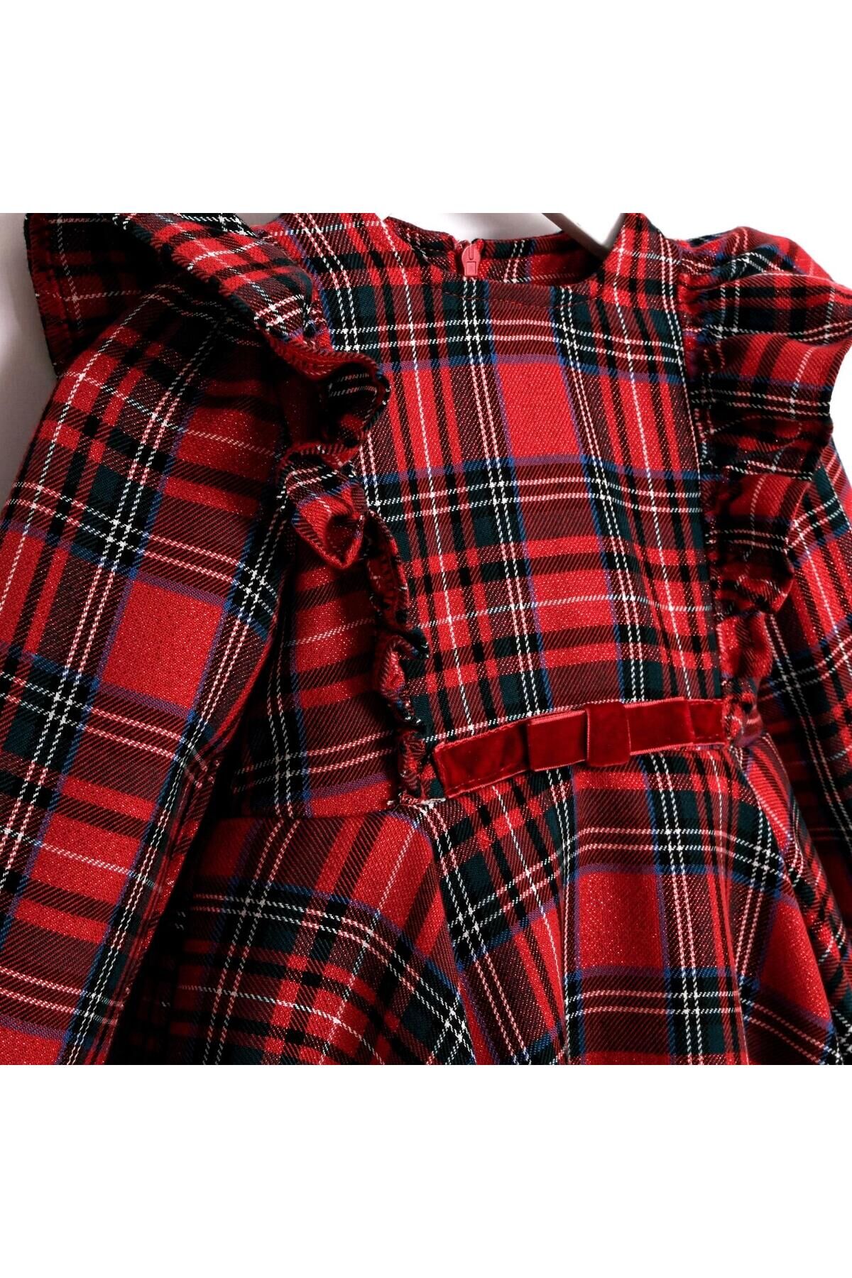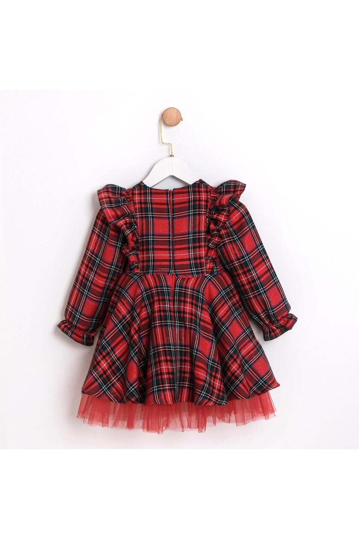 Julliet Ekose Desenli Kırmızı Etek Ucu Tüllü KIz Çocuk Özel Gün Elbisesi