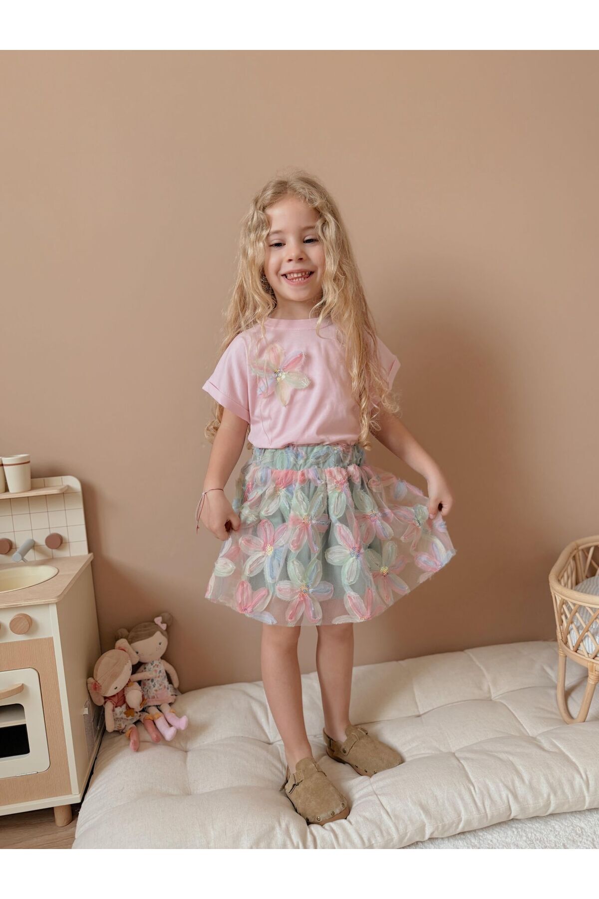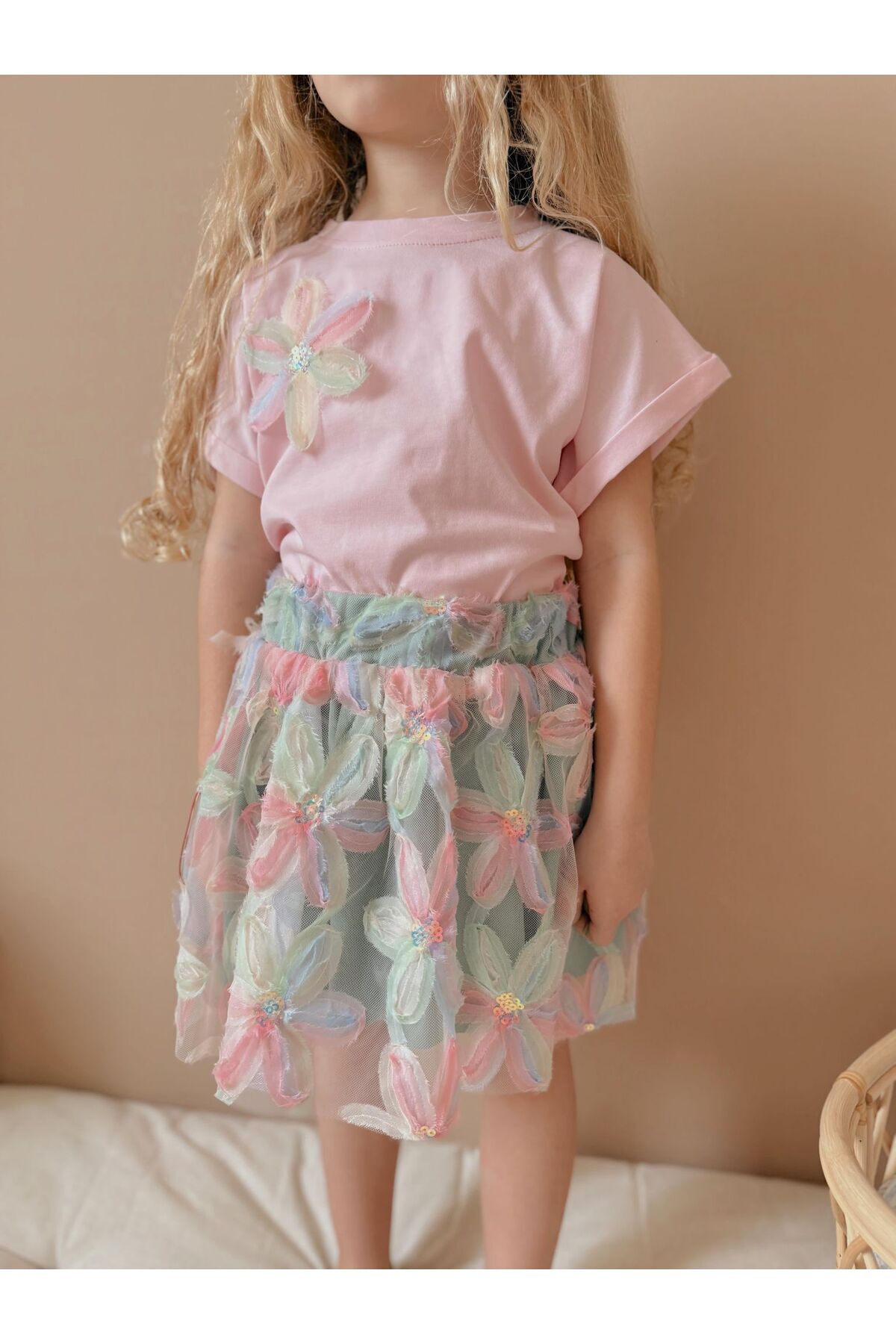 Kabartma Çiçekli Etekli Blüzlü İkili Kız Çocuk Takım