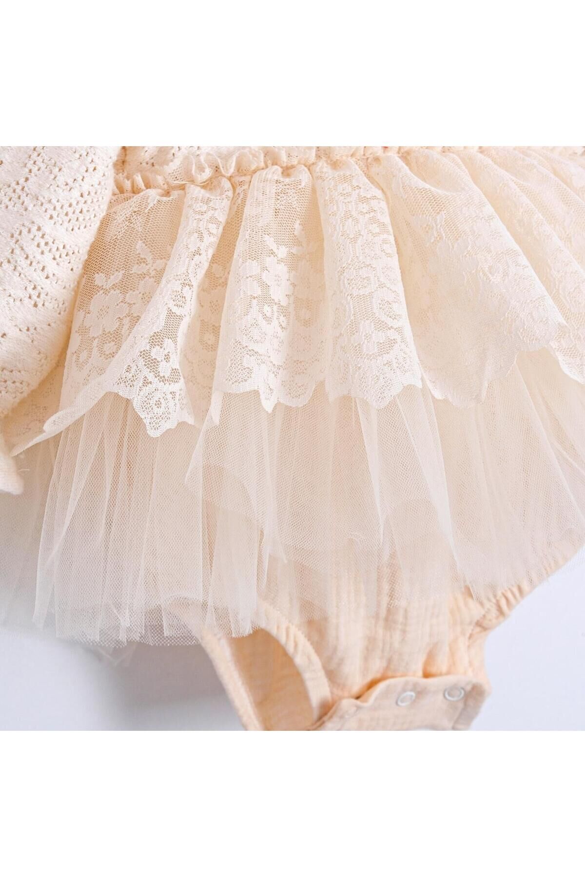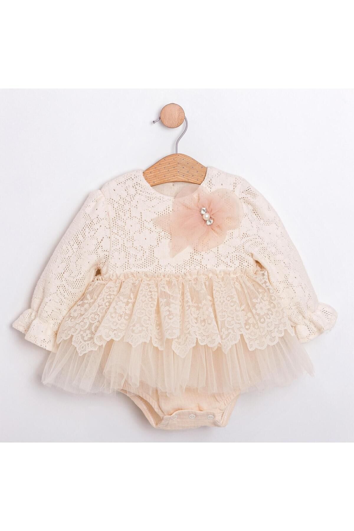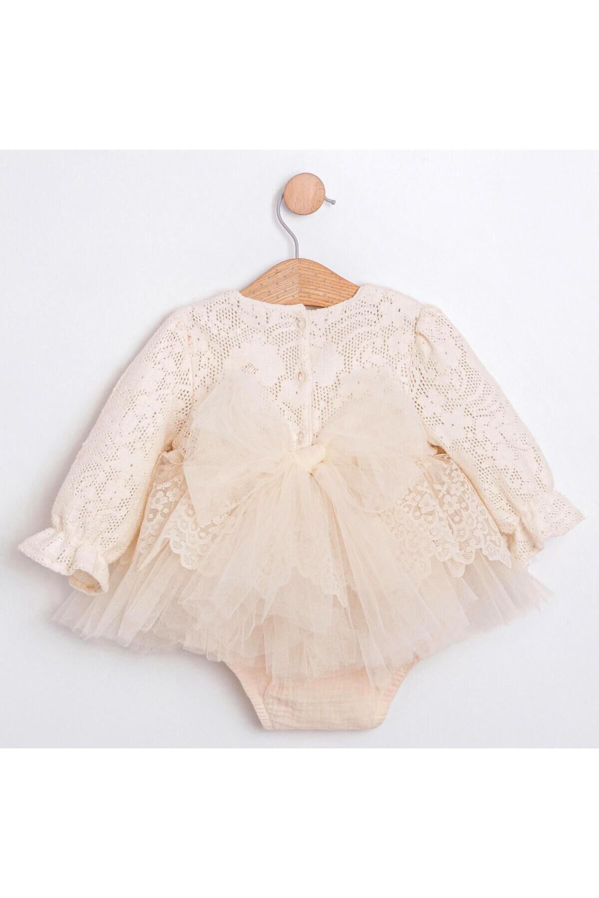 Lovely Uzun Kollu Arkası Fiyonklu Dantel Kız Bebek Romper