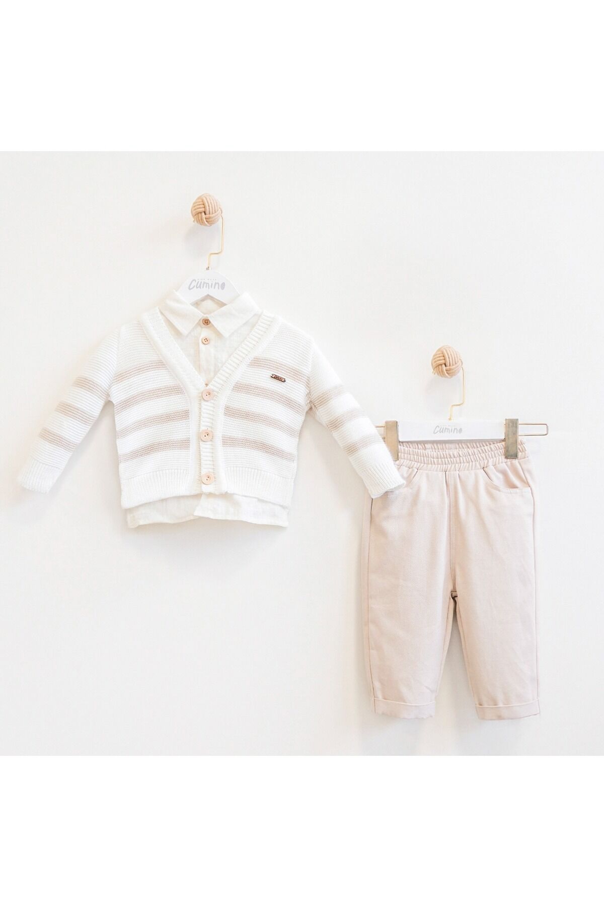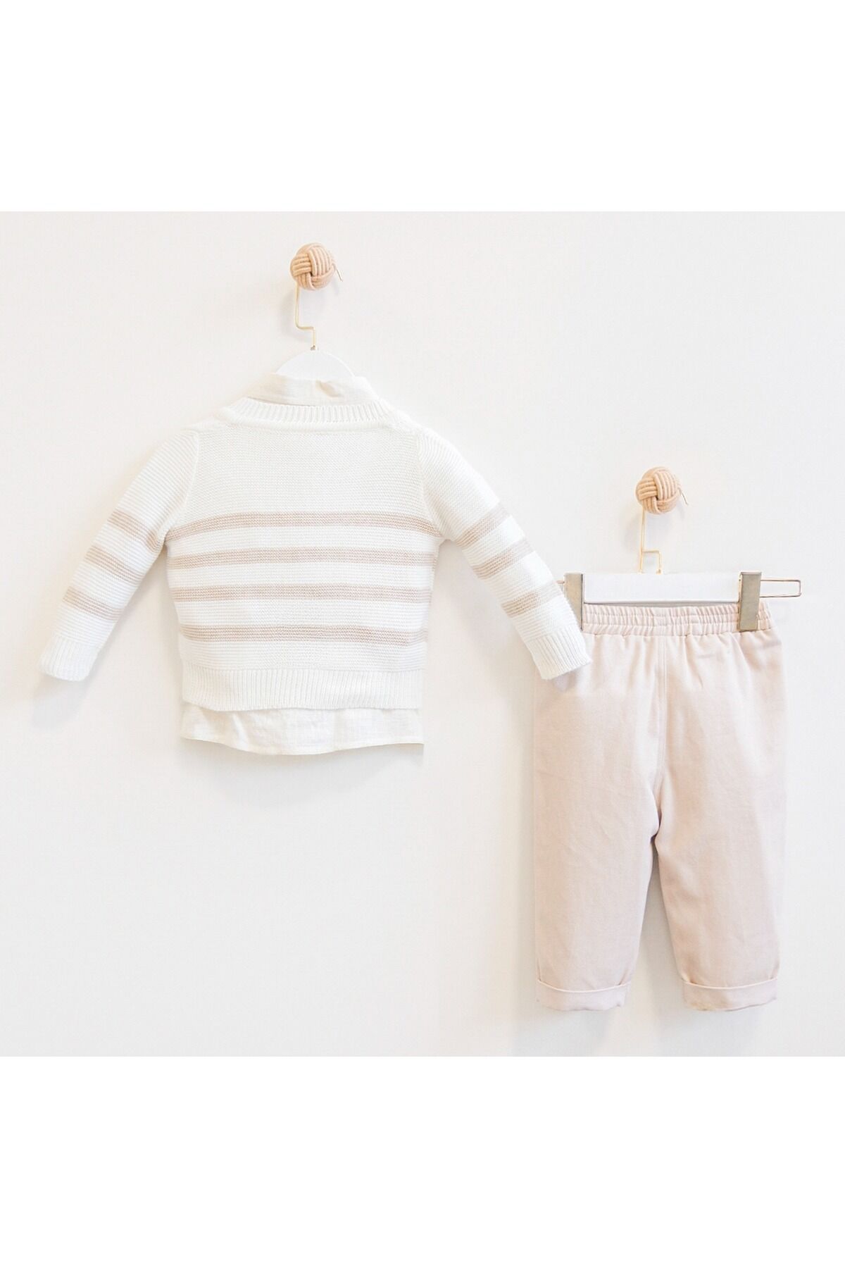- İnce yapısıyla rahat hareket etme özgürlüğü sunar.; - Kemer veya kuşak gerektirmeyen tasarımı ile pratik kullanım sağlar.; - Flamlı pamuk dokuması sayesinde yumuşak bir dokunuşa sahiptir.; - Üç parçadan oluşan set; hırka, gömlek ve pantolon içerir, şıklığı tamamlar.; - Makinede hassas yıkama imkanıyla kolay bakım avantajı sunar.; - Tüm sezonlarda kullanabileceğiniz çok yönlülükteki tasarım.; - Çift cepli yapısı küçük eşyalarınız için pratik saklama alanları oluşturur.; - Polo yaka detayı ile klasik ve modern tarzı harmanlar.; - Gömlek: %52 viskoz, %46 pamuk ve %2 akrilik karışımından oluşurken, hırka: %100 akrilikten yapılmıştır.; Pantolon ise %50 keten ve %50 viskoz içermektedir.; - Normal bel ve boru paça kesimiyle günlük giyime uygun konforlu bir oturuş sağlar.; - Dokuma kumaşı dayanıklılık ve uzun ömürlü kullanım vaat eder.; - Bebeklerden yetişkinlere kadar her yaş grubuna hitap eden geniş kullanıcı kitlesi düşünülerek tasarlanmıştır.; - Standart kalıp seçeneğiyle vücuda tam oturan ama sıkıştırmayan ideal duruş sergiler.; - Uzun kollu tasarım soğuk günlerde ekstra koruma sunarken stilinizi de ön plana çıkartır.; - Alt-üst takım olarak kombinlenebilen bu setle trend görünümünüz tamamlanır.