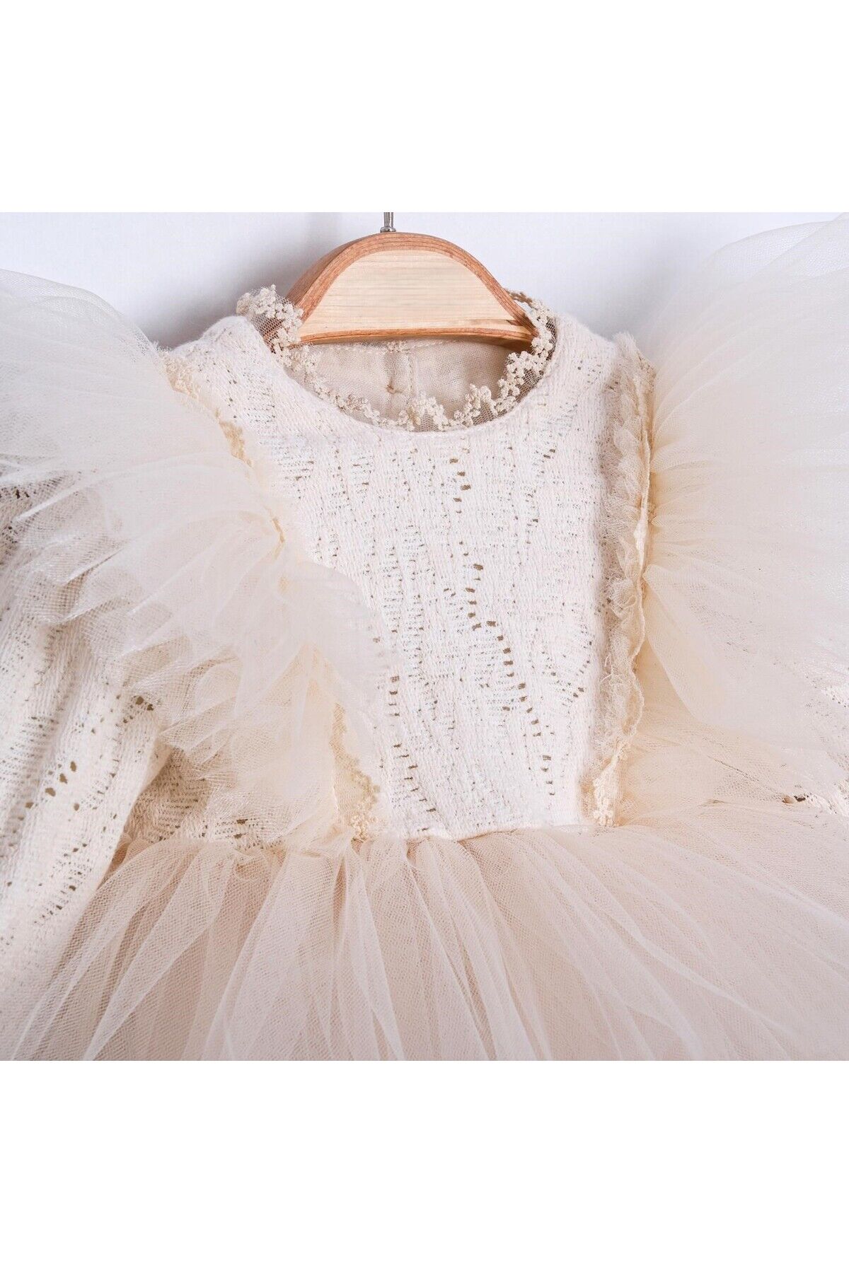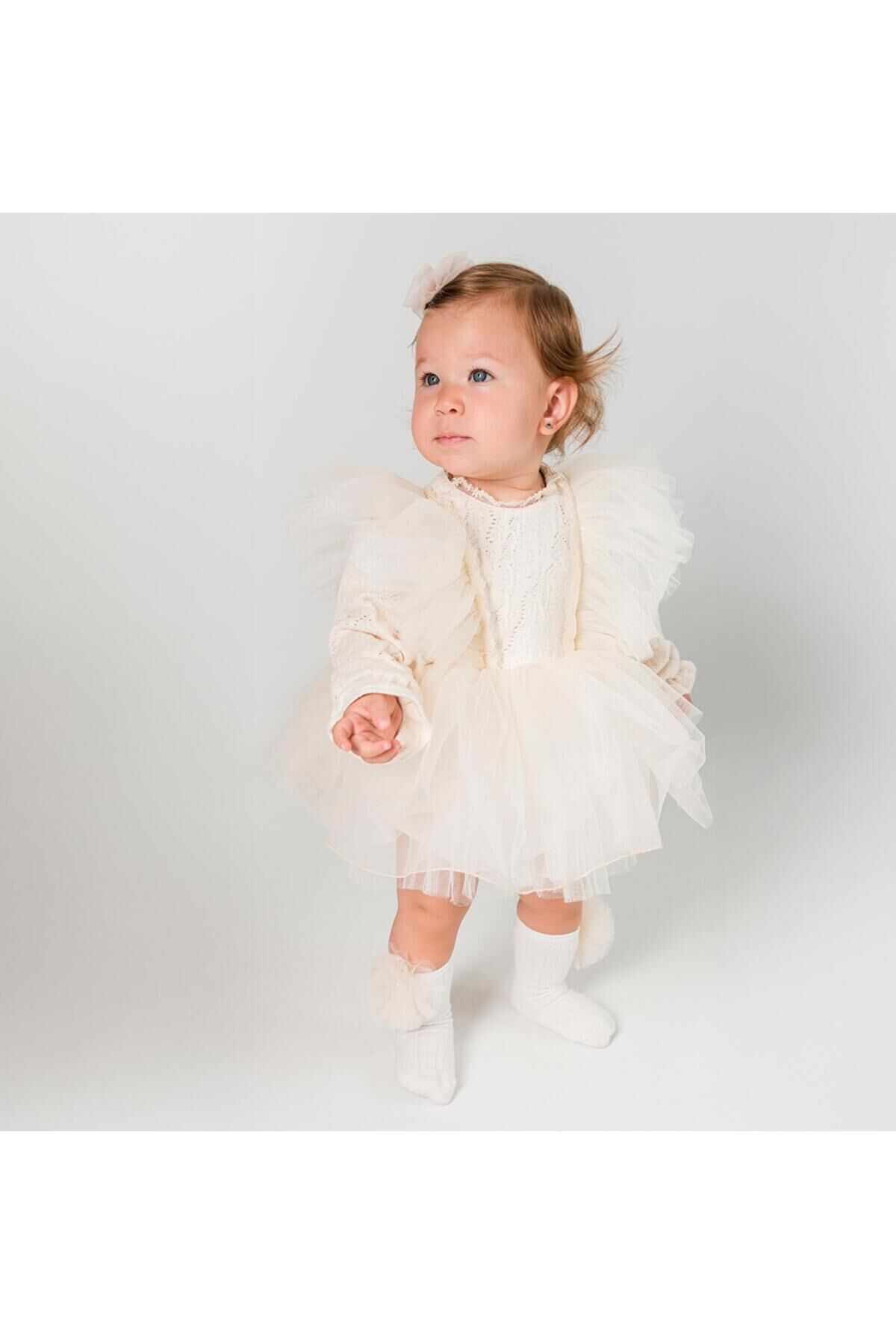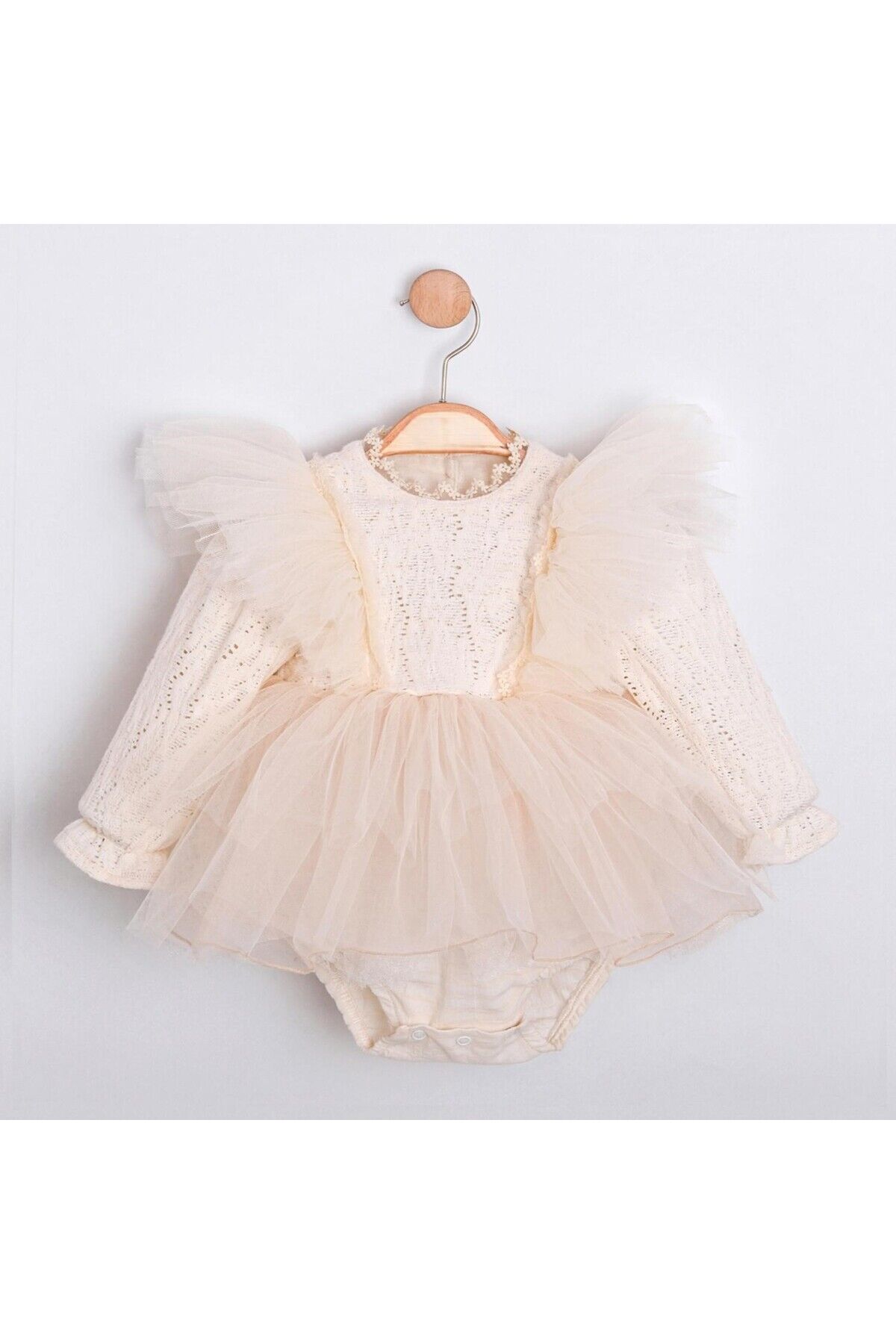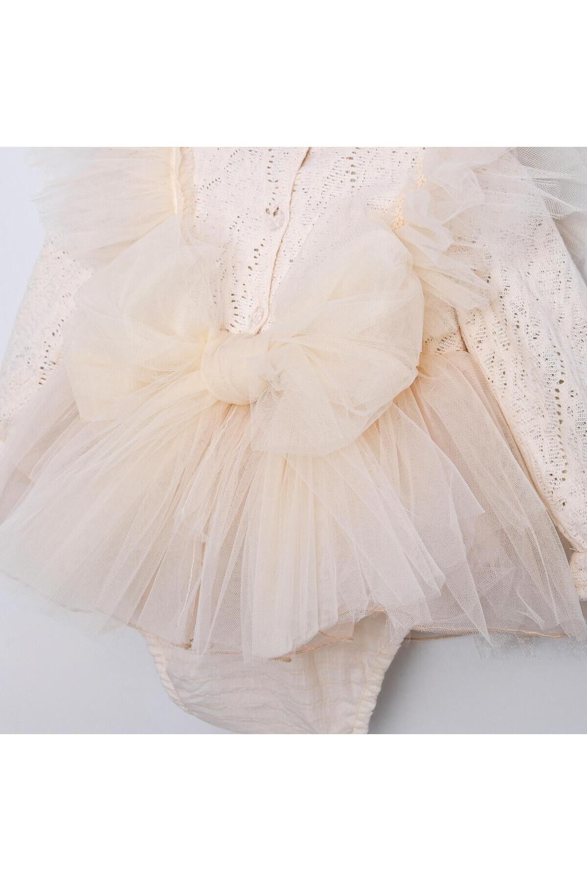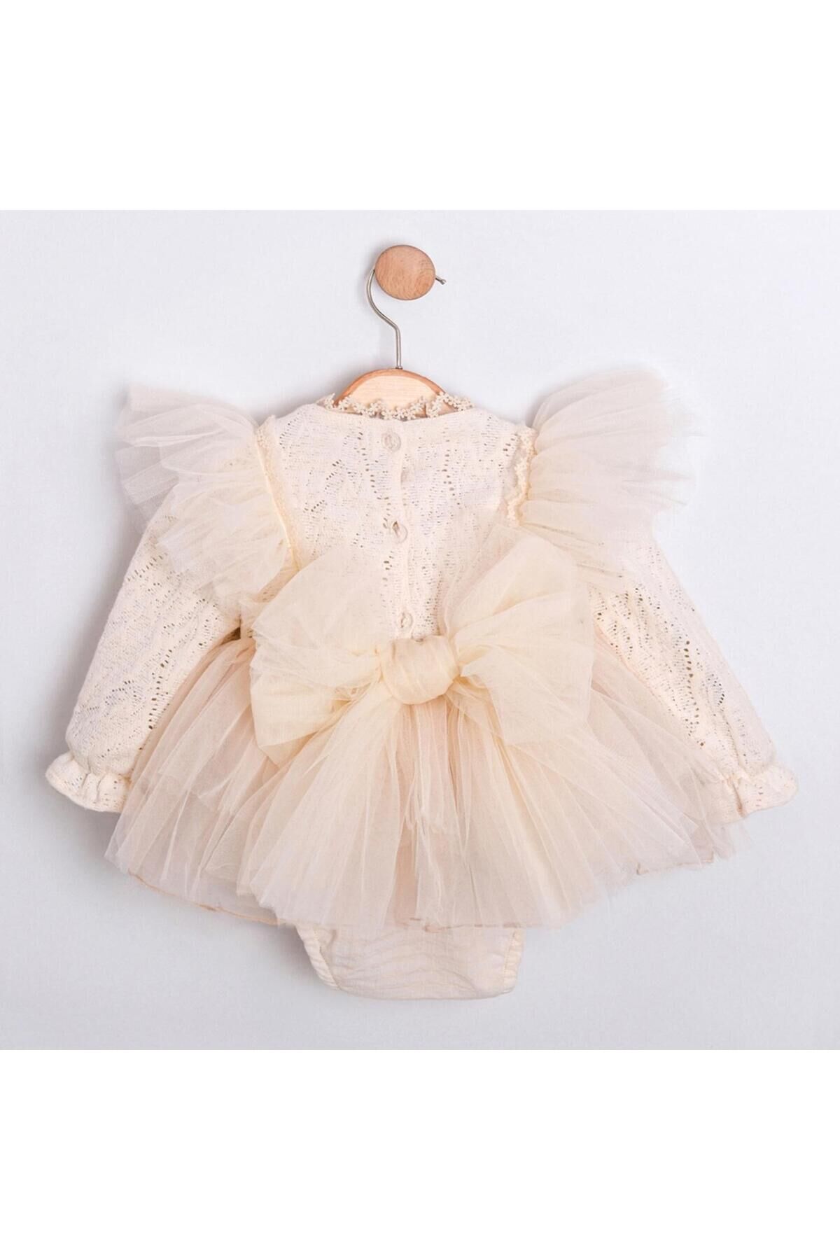 Milani Omuz Kısmı Fırfırlı Arkası Fiyonklu Bej Kız Bebek Romper