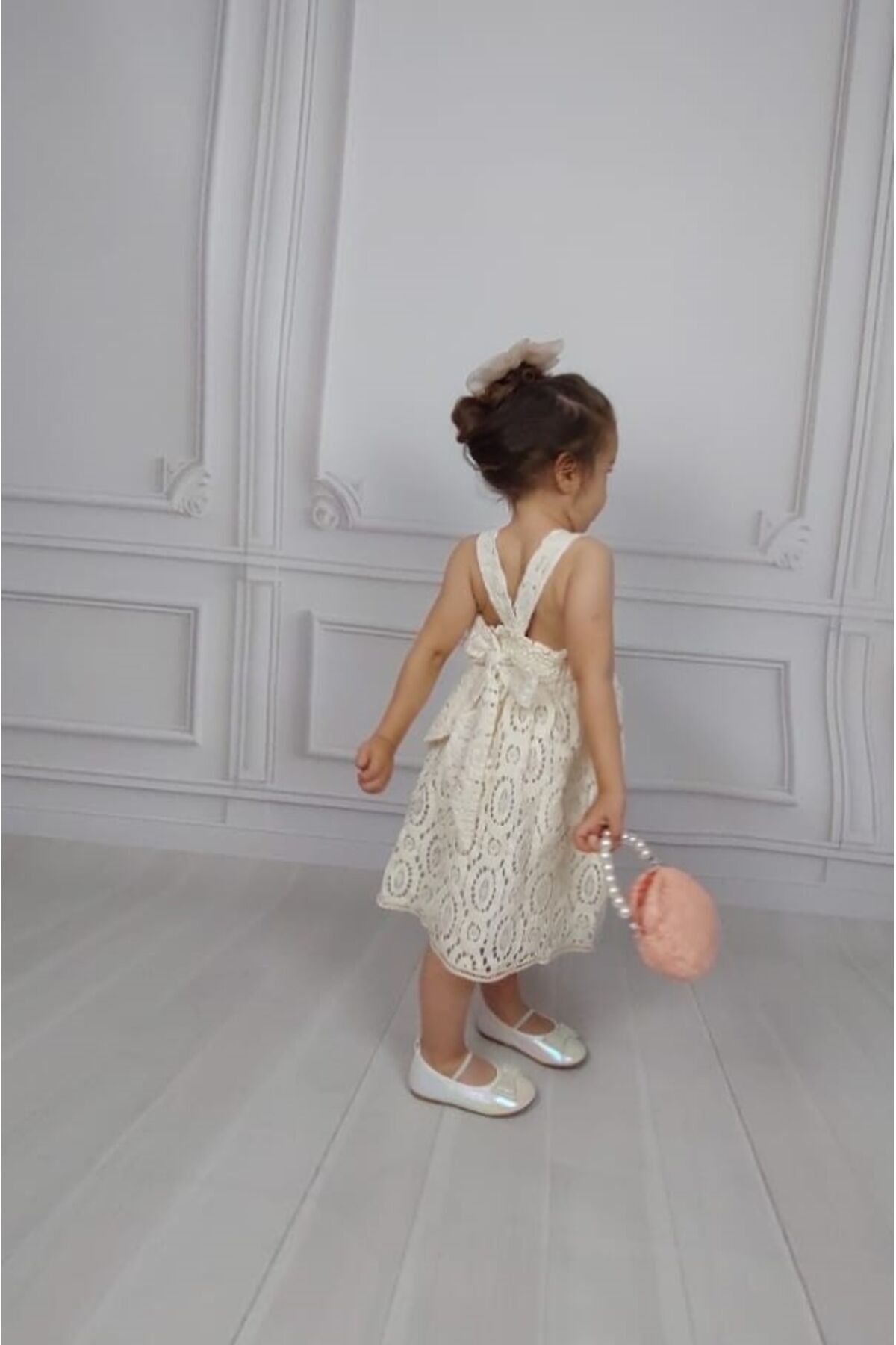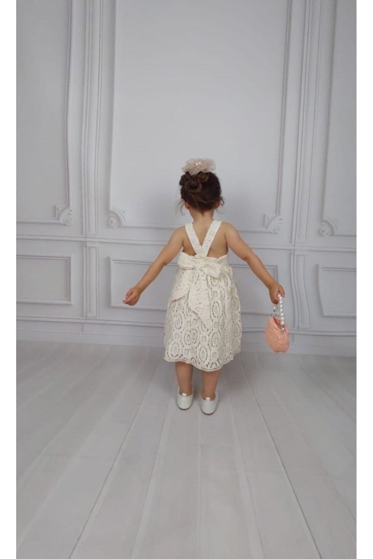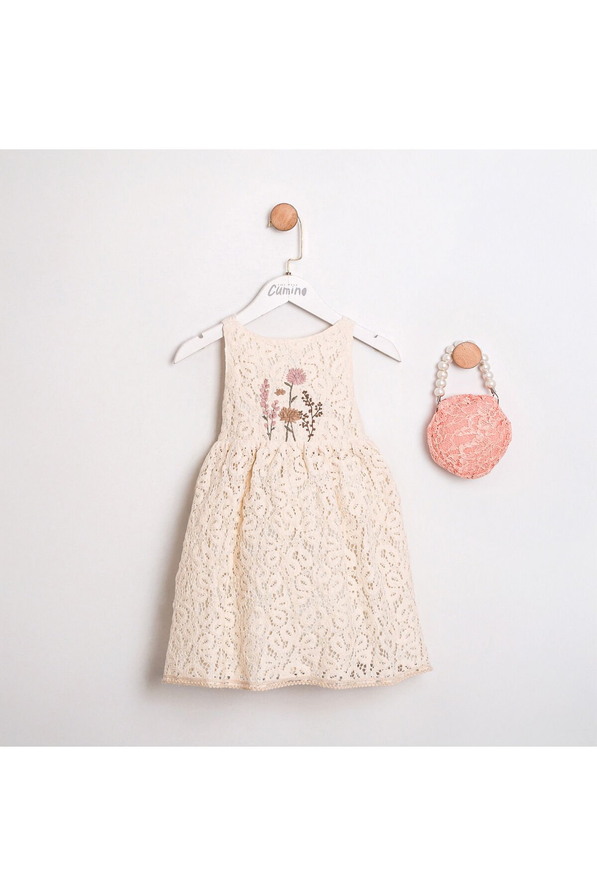Nakışlı Arkası Çapraz Bağlamalı ve Çanta Aksesuarlı Kız Çocuk Dantel Elbise