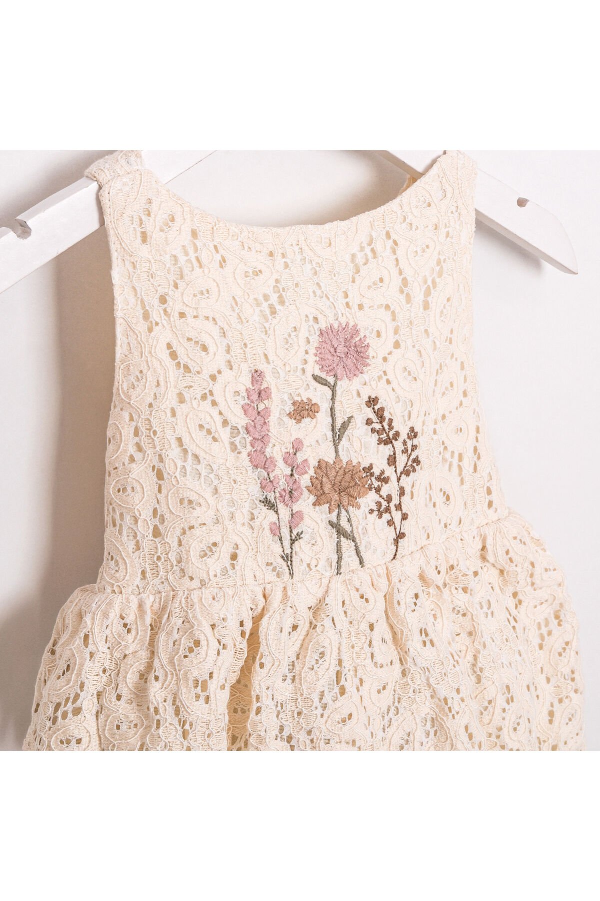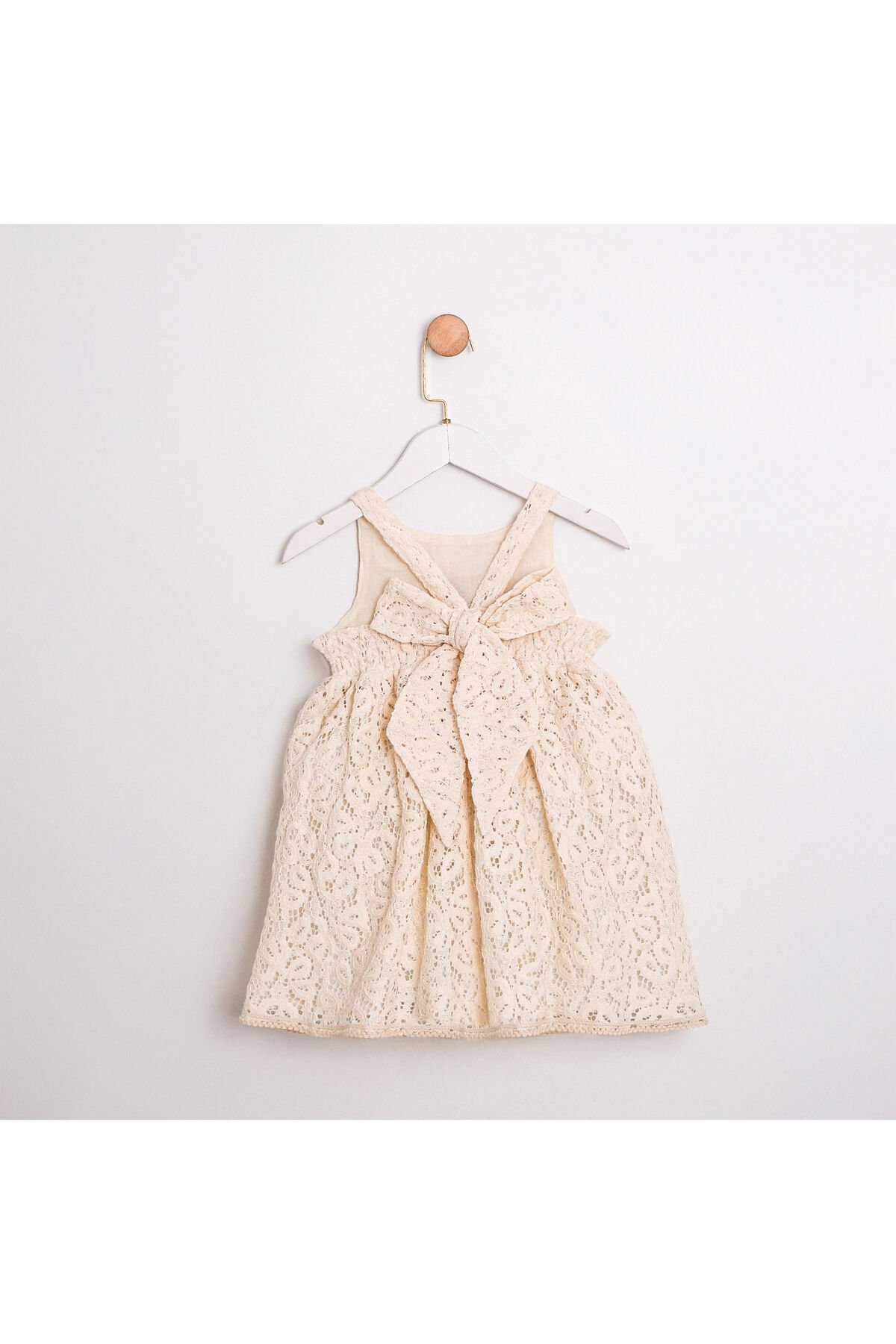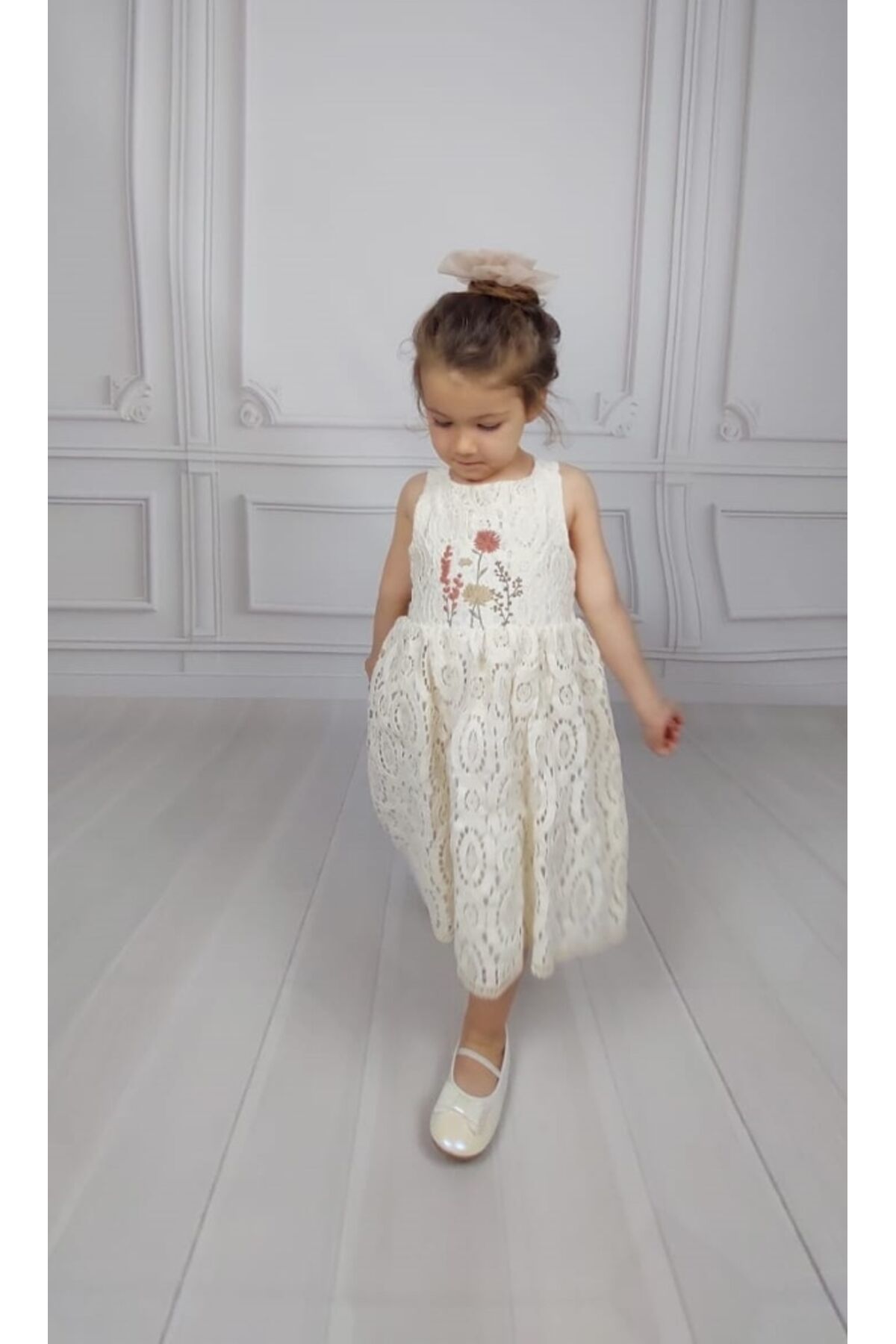 Nakışlı Arkası Çapraz Bağlamalı ve Çanta Aksesuarlı Kız Çocuk Dantel Elbise