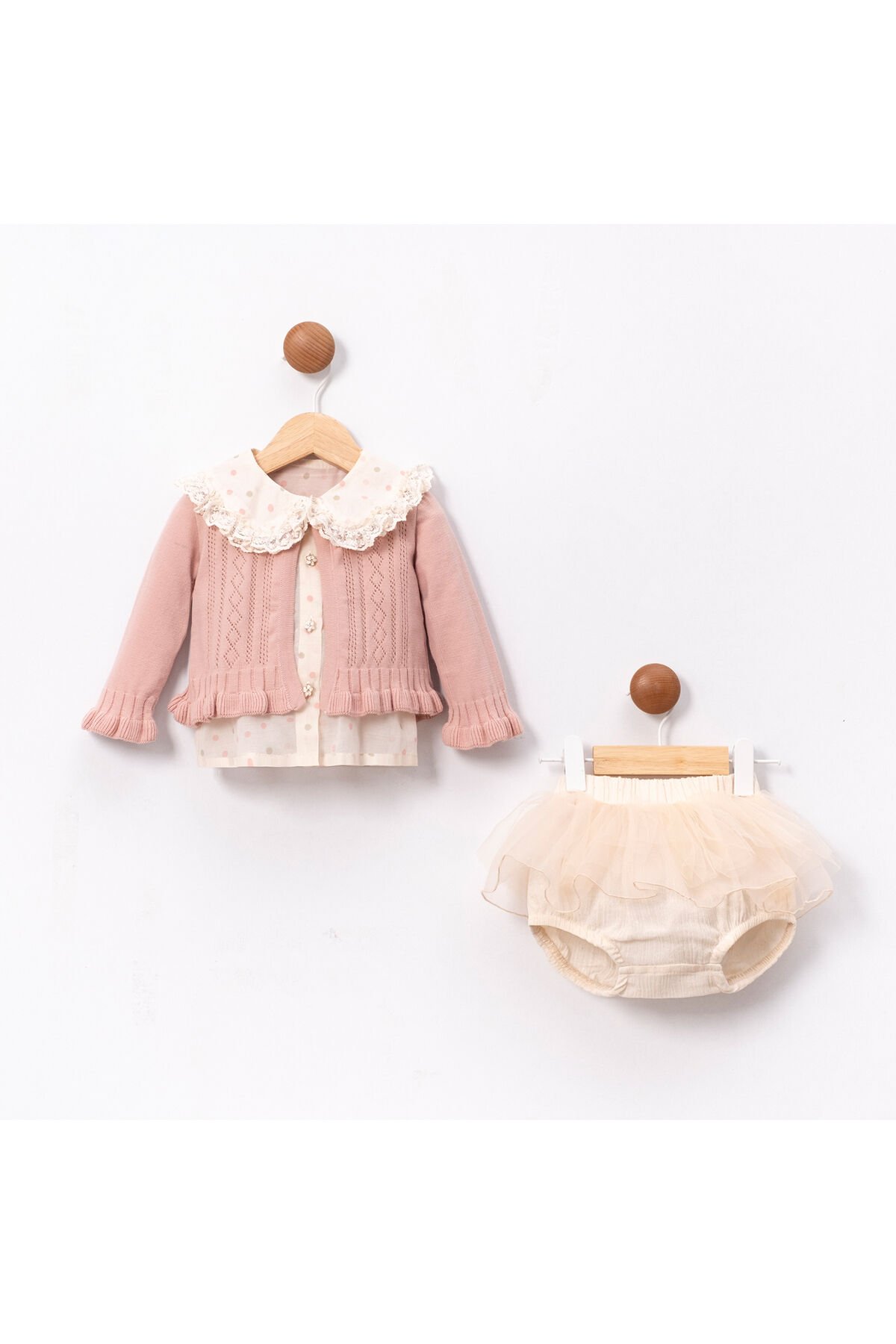 - Bebeğinizin konforu düşünülerek tasarlanmış, normal bel kesimiyle rahat bir kullanım sunar.; - Bebe yaka detayı ile şıklığı ve rahatlığı bir arada sunan üçlü kız bebek takım.; - Pratik kullanım için 3 parçadan oluşan set; hırka, şort ve alttan oluşur.; - Cepsiz tasarımı sayesinde bebeğinizin eşyalarını kolayca taşımasına olanak tanır.; - Orta kalınlıkta kumaşı ile mevsim geçişlerinde ideal sıcaklık sağlar.; - Astarsız yapısıyla bebeğinizin cildine nazik dokunuşlar sunar.; - Düz tasarımıyla sade ve şık bir görünüm elde edilirken, lastik detayları pratik kullanım sağlar.; - Petite koleksiyonunun zarif çizgilerini yansıtan bu takım, bebek gardırobunun vazgeçilmez parçası olacak.; - Slim siluetiyle modern ve şık bir görünüm kazandırırken, hareket özgürlüğünü kısıtlamaz.; - Örme dokuma tipi sayesinde esneklik ve konforu bir arada sunar.; - Kemersiz yapısıyla rahatlık ve şıklığı bir arada yaşatır.; - %100 pamuklu materyal bileşeni cildi tahriş etmeden yumuşaklık sağlar.; - Tüm sezonlarda giyilebilen bu takım, her mevsim bebeğinizin rahat etmesini garanti eder.; - Türkiye menşeli olmasıyla yerli üretim kalitesini yansıtır.; - Kutusuz olarak sunulan bu ürünle paketleme kolaylığı sağlar.; - Puantiyeli deseniyle neşeli ve canlı bir stil oluşturur.; - Kısa boyu sayesinde bebeğinizin hareket serbestliğini kısıtlamaz.; - Regular kalıp ile her bedene uyum sağlayacak şekilde tasarlanmıştır.; - Örme kumaş tipi dayanıklılık ve konforu beraberinde getirir.; - Bebek yaş grubuna özel olarak tasarlanmıştır; miniklerin rahatlığı düşünülerek hazırlanmıştır.; hem şık hem de fonksiyonel bir seçenektir.; - Standart kol tipiyle günlük kullanım için idealdir; hareket serbestliği sağlar.; - Uzun kol boyu sayesinde bebeğinizin kollarını sıcak tutarken stil sahibi görünümünden ödün vermez.;