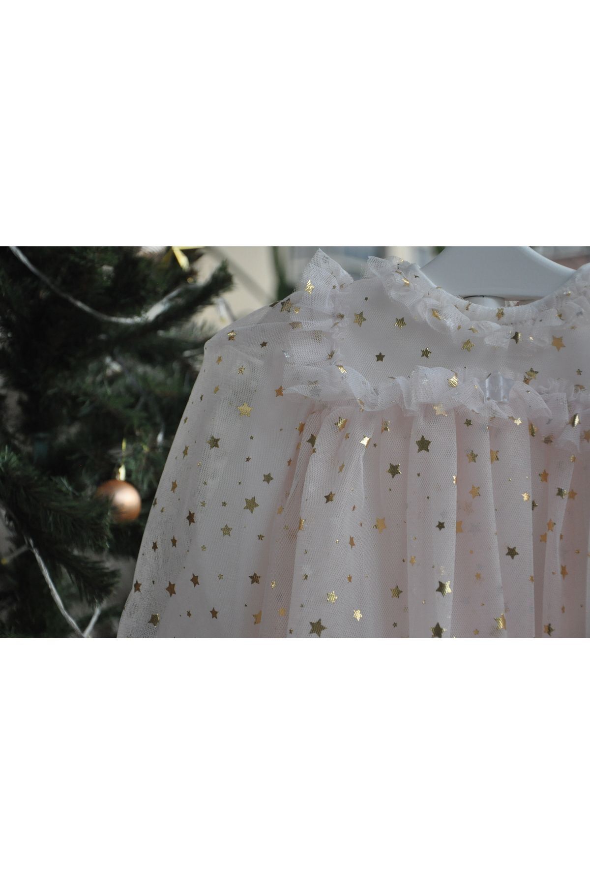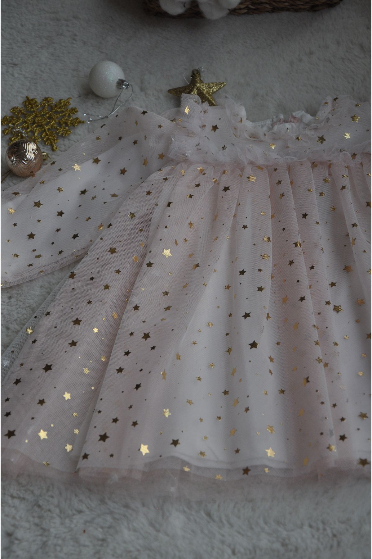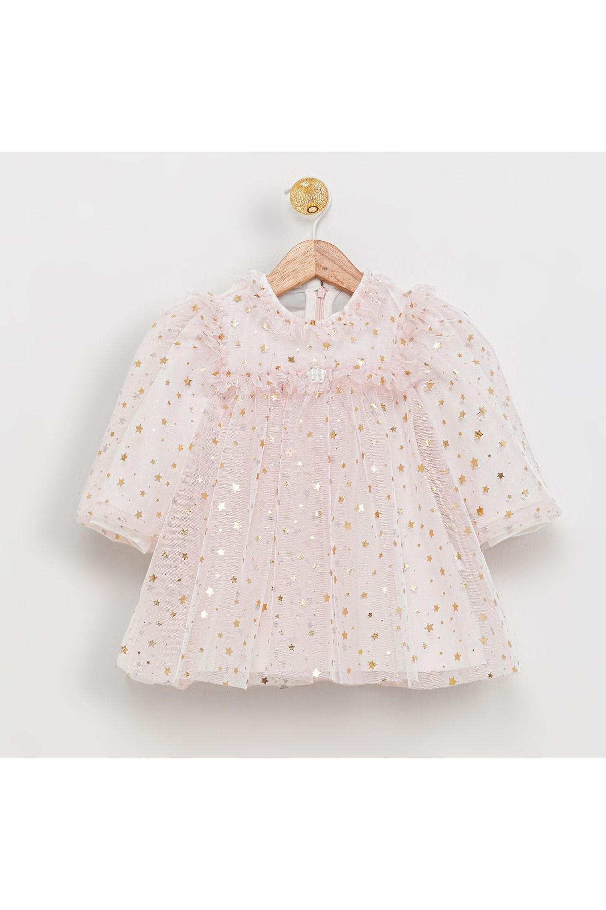 Parıltılı tasarımıyla dikkat çeken bu pembe bebek elbisesi, özel günlerde minik prenseslerin vazgeçilmez seçimi olacak. Altın yıldız desenli tül kumaşı ve katlı tasarımıyla zarif bir görünüm sunarken, yumuşak astarı sayesinde bebeğinizin hassas cildine nazikçe dokunur. Fırfırlı omuz detayları ve göğüs kısmındaki inci süsleme elbiseye şıklık katar.