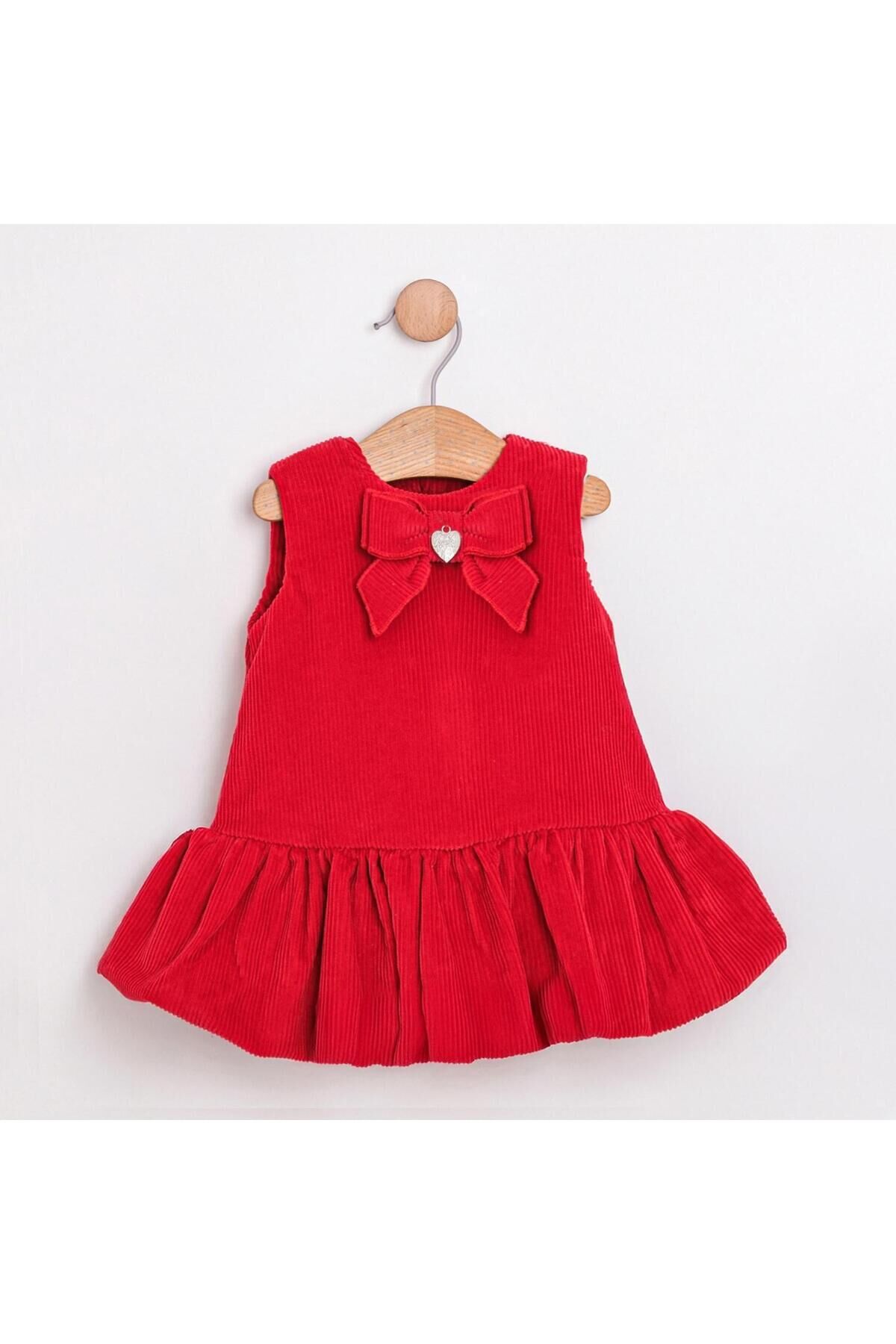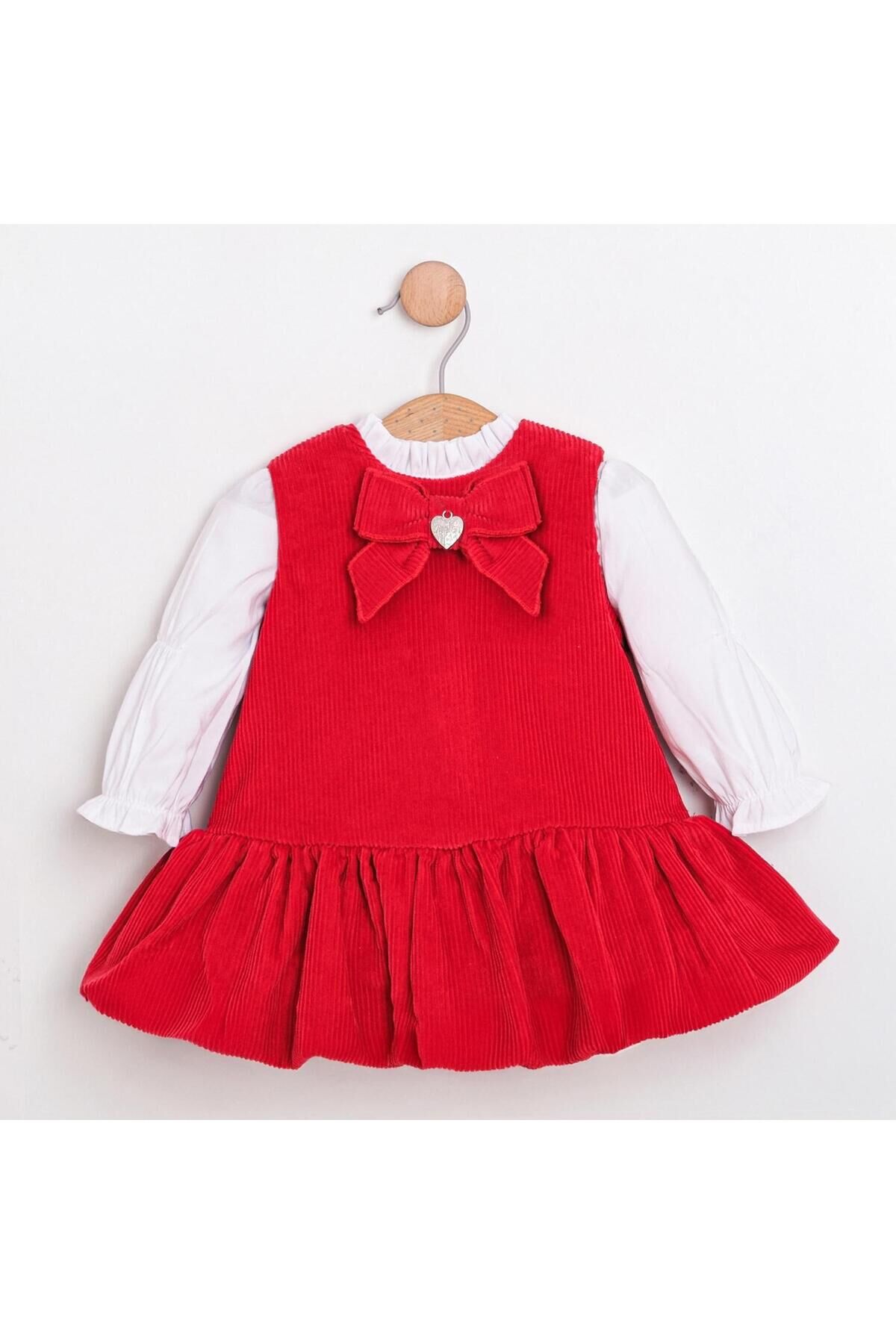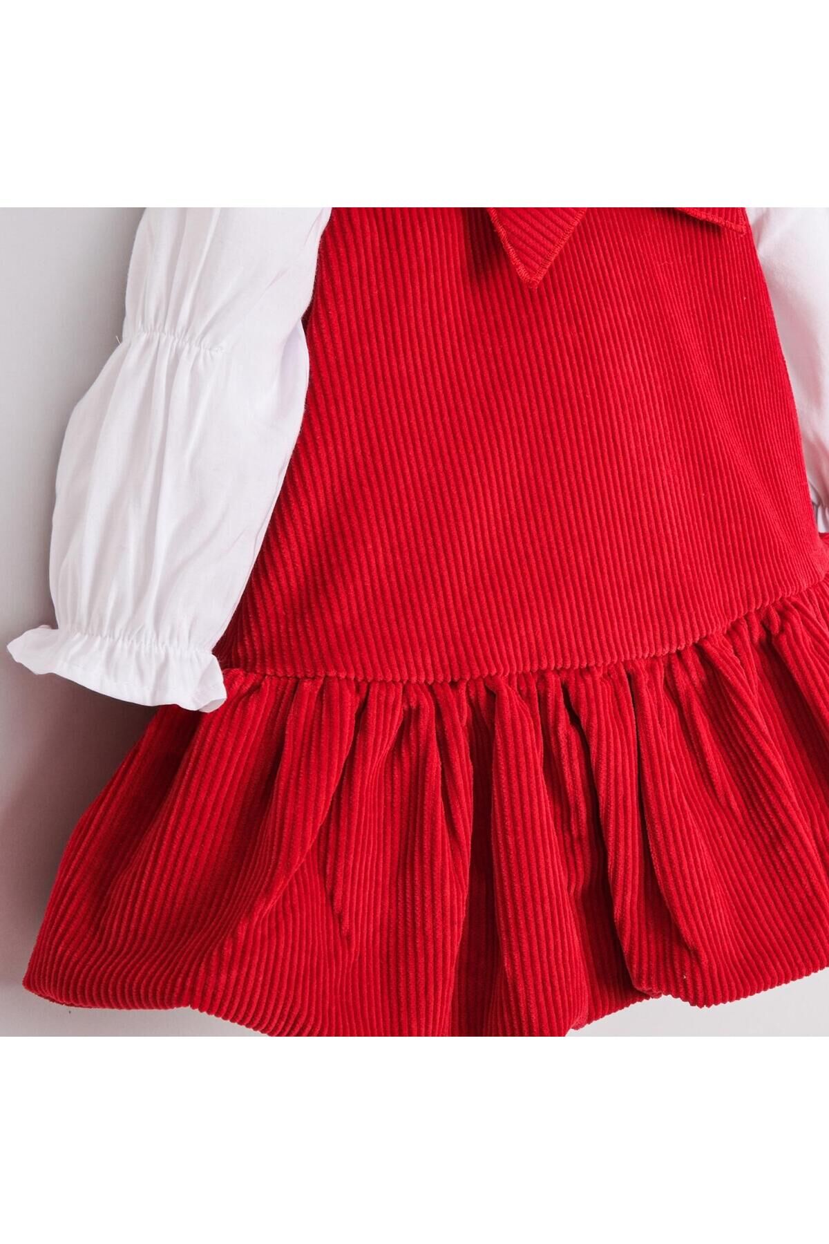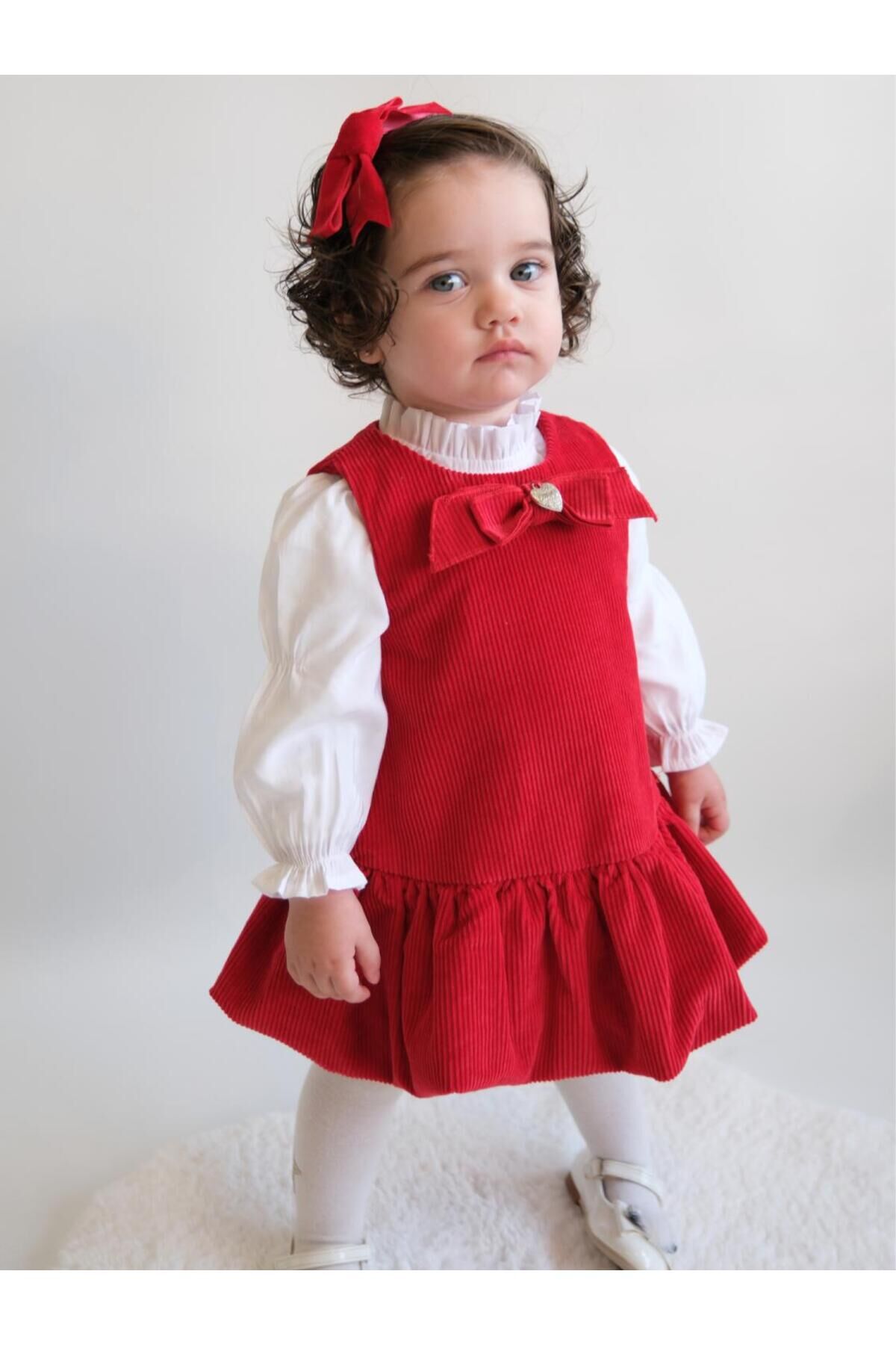 Tina Kırmızı Fitilli Kadife Balon Etekl Bebek Elbise ve Blüzlü Takım