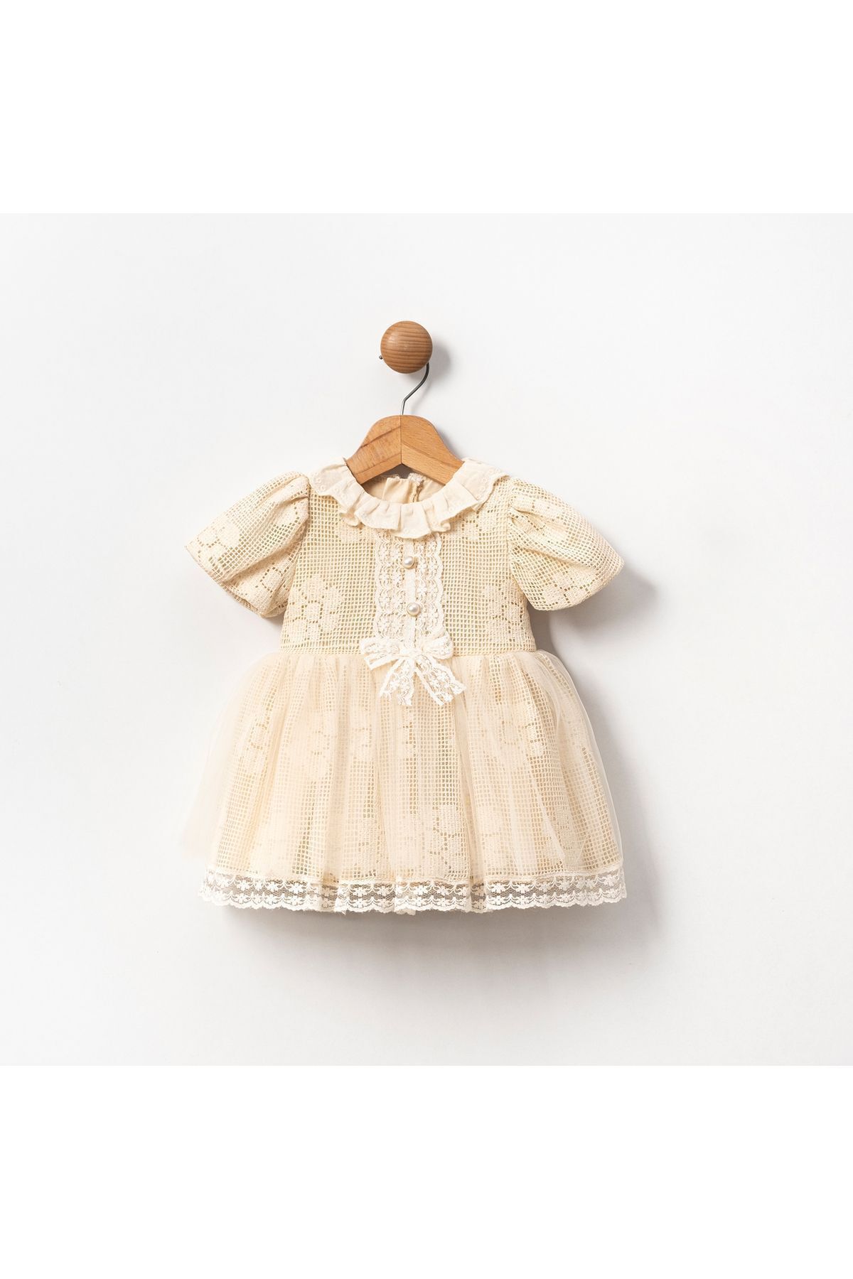 Regular kalıp sayesinde rahat hareket etme özgürlüğü sağlar ve gün boyu konfor sunar.; Pamuklu kumaşı, nefes alabilir yapısıyla terletmez ve sıcak havalarda bile serin tutar.; Dokuma kumaş tipi, dayanıklılığı artırarak uzun süreli kullanım imkanı verir.; Kısa kol boyu ve bisiklet yaka tasarımı, yaz ayları için idealdir ve bebeğinizin hareket kabiliyetini kısıtlamaz.; Standart boyu ile farklı yaş gruplarına uygun olarak tasarlanmıştır; büyüme evresinde de rahatlıkla kullanılabilir.; Party koleksiyonuna ait bu elbise, şık detaylarıyla özel günlerde bebeğinizin parlamasını sağlar.;